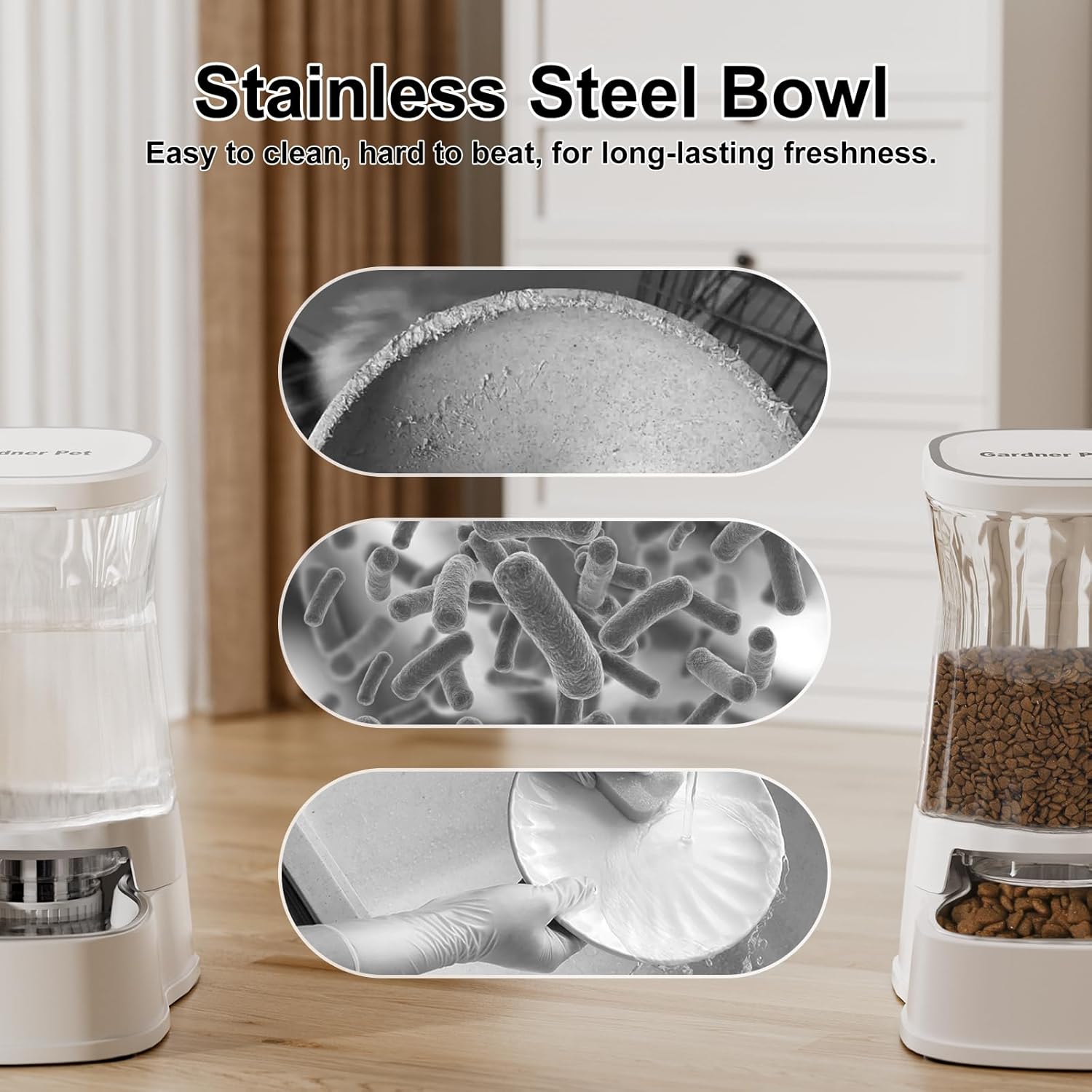 Automatic Pets Gravity Feeder and Water Dispenser Set, 1Gallon x 2 Stainless Steel Food Feeder and Waterer, 100% BPA-Free Water Bowl Dispenser for Small&Medium Dogs, Cats, Puppies(White)