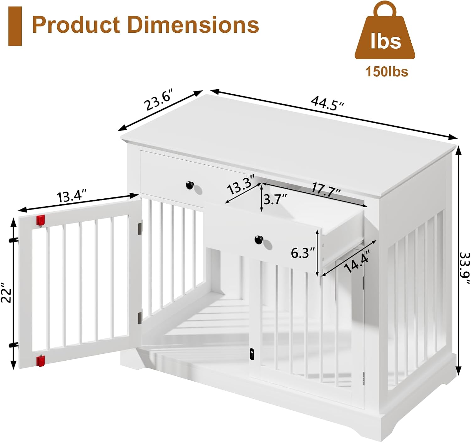 - PUKAMI Dog Crate: Overall Size: 44.5"L x 23.6"W x 34.5"H; Drawers Size: 13.4"L x 18.5"W. This furniture style dog crates can be serves as End Table,Display Stand, etc. Rustic color and appearance complement your home decor