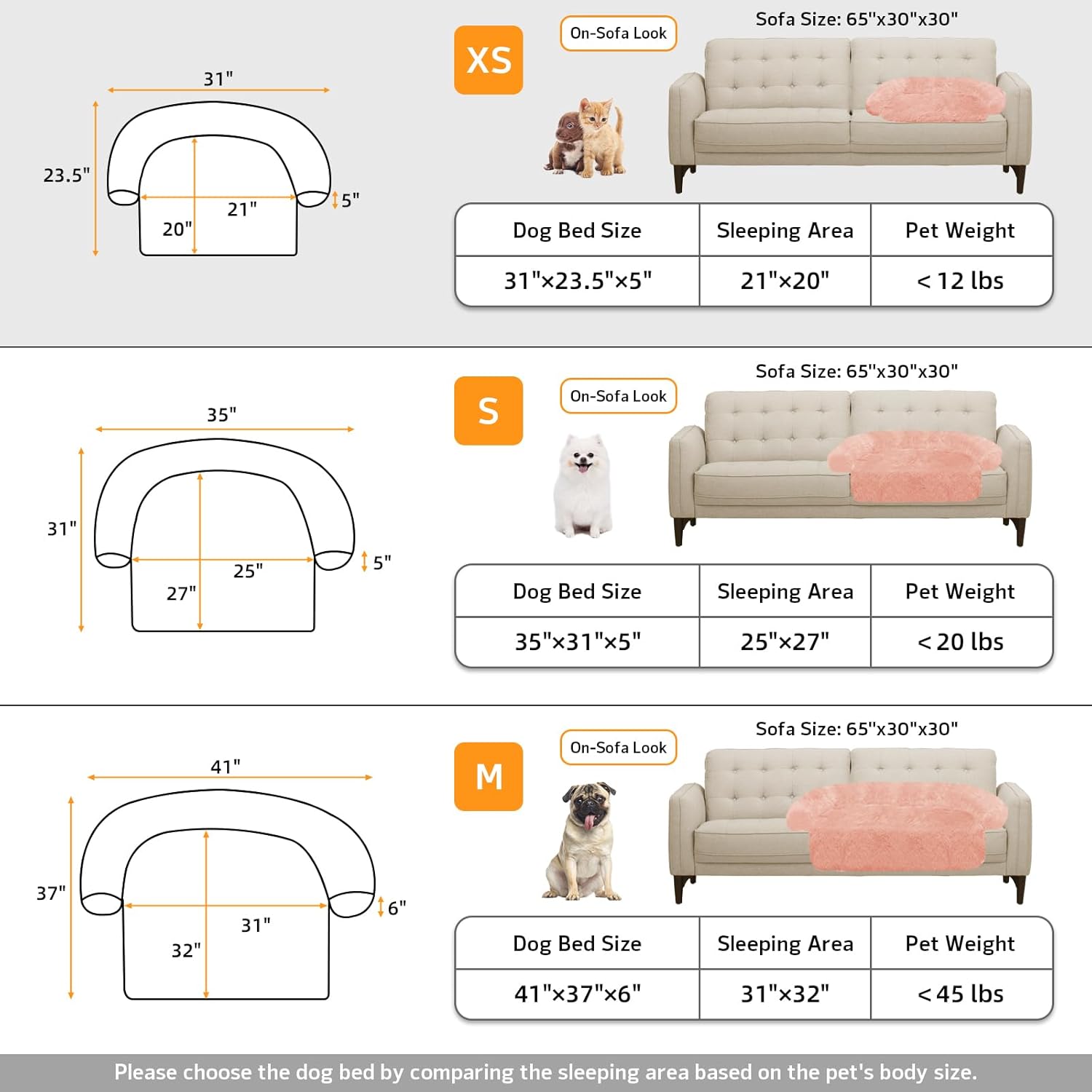 - 【Multiple Size Selection】The couch pet bed has 5 sizes for you to choose from. XS: 31"x23.5" dog bed for small pets. S: 35“x31" dog bed for cats and small dogs. M: 41”x37" dog bed for medium dogs. L: 45“x37" dog bed for large dogs. XL:53"x39" dog bed for large dogs. We have enlarged the sleeping area for pets to give dogs more space.