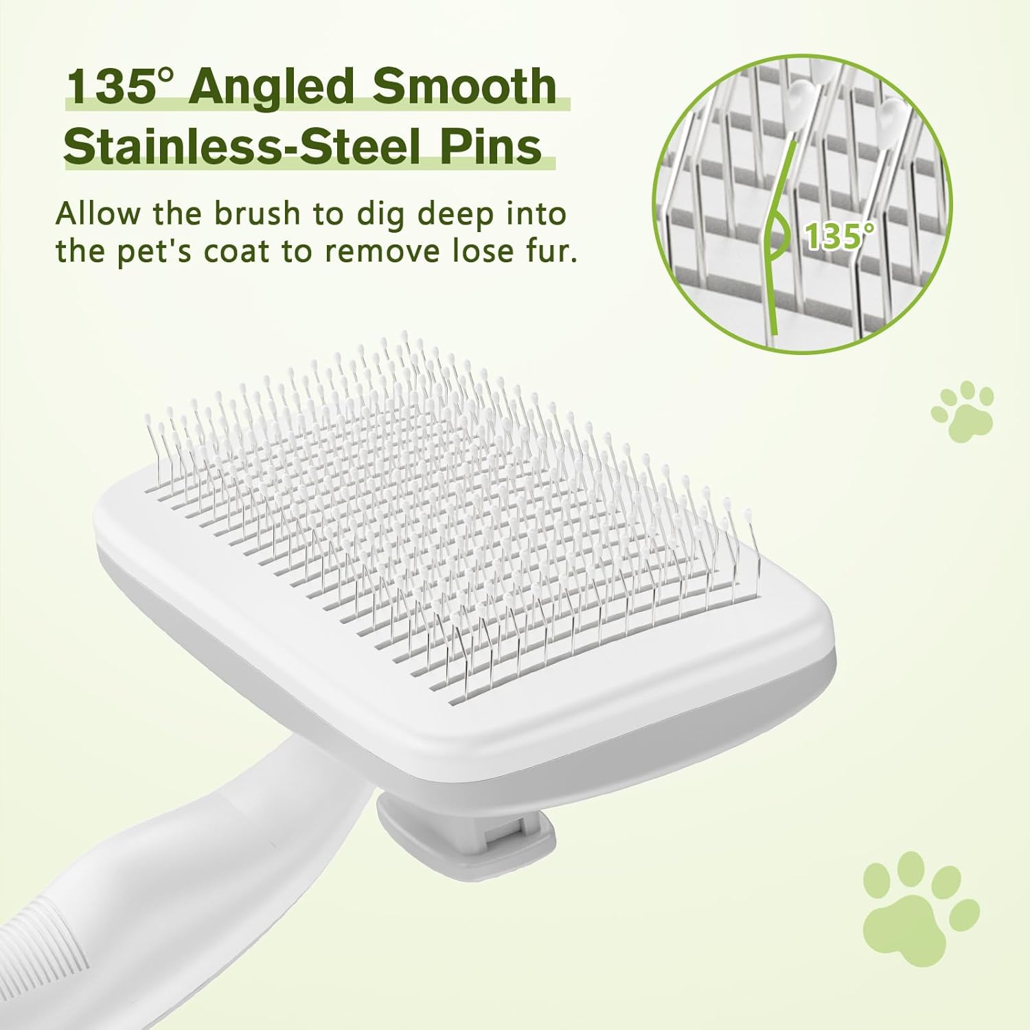 - EFFICIENT FUR REMOVAL, GENTLE ON YOUR PET'S SKIN : The pet hair brush is designed with fine 135ยฐ stainless steel bristles and gentle massage particles that effectively remove loose hair, dander, & dirt trapped beneath the fur without causing any discomfort or irritation to the pet's skin. Leave the pet's fur soft and shiny!
