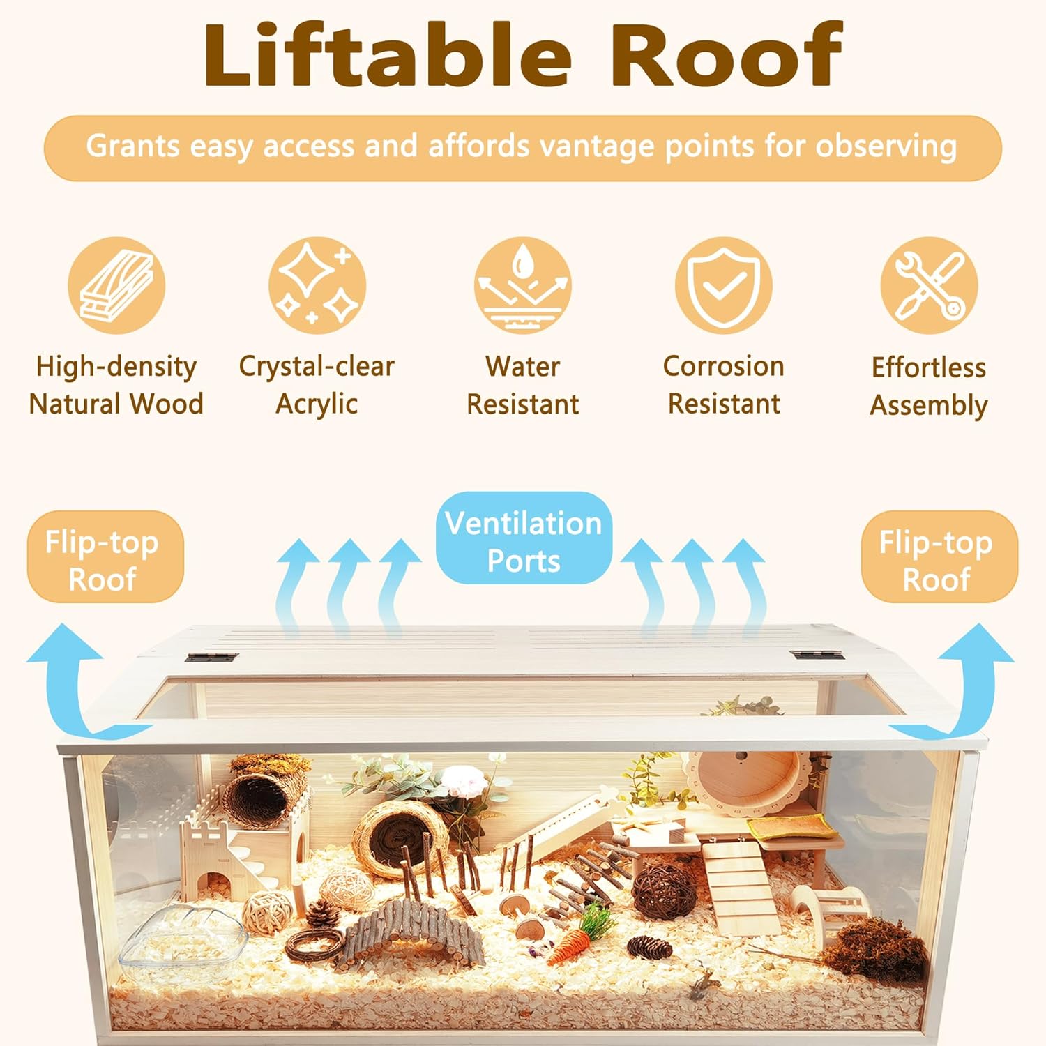 - 【Chew-proof Design】Unlike ordinary wooden cages, our boards feature polyester coating on both sides, enhancing waterproofing, corrosion resistance, and thwarting hamster attempts to chew through. Proven by hundreds of hamsters lovers, hamsters have no interest chewing through our cage. Designed with top vents for optimal air circulation and odor elimination, along with a lift-up roof window for easy access and enhanced visibility.
