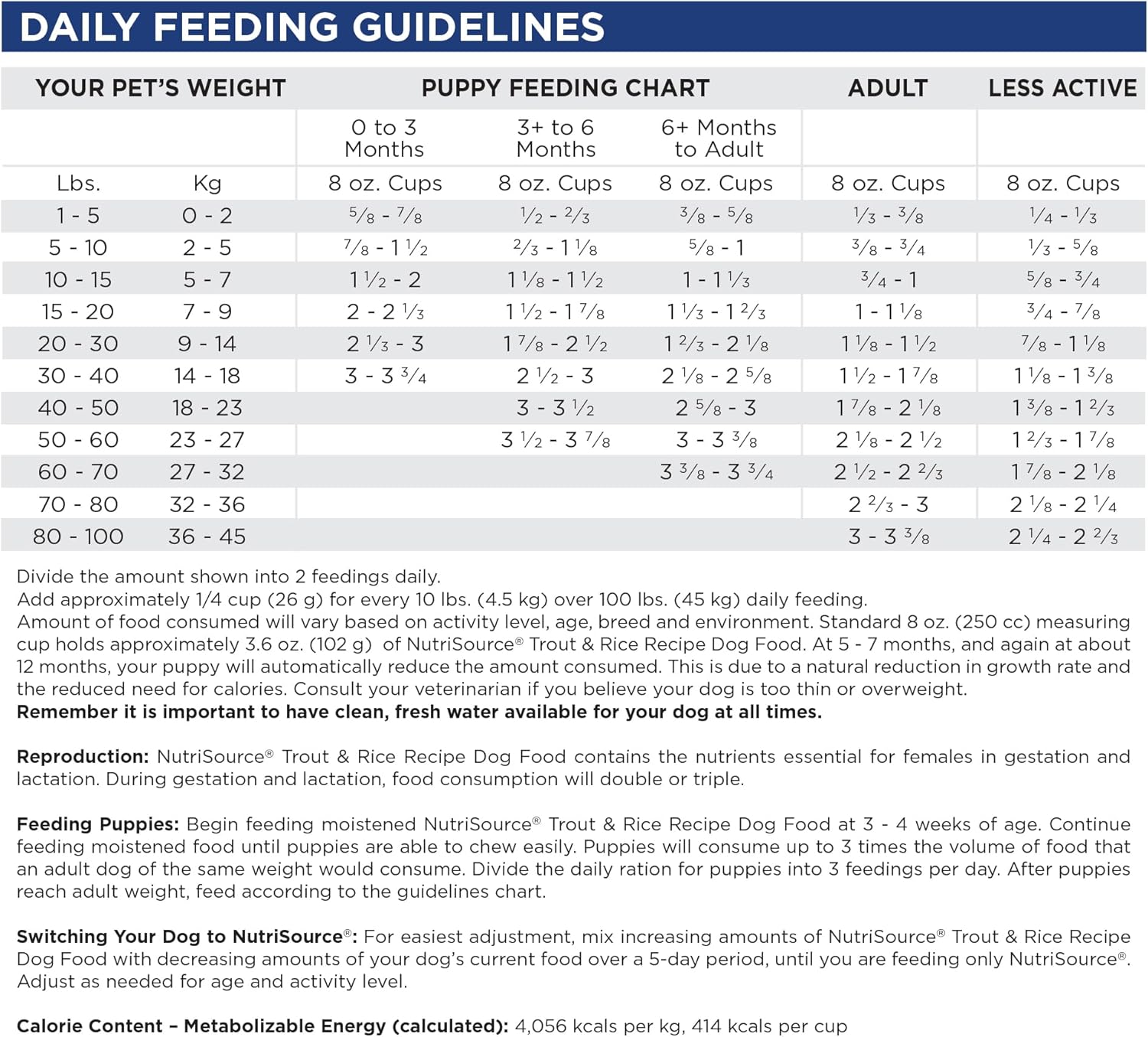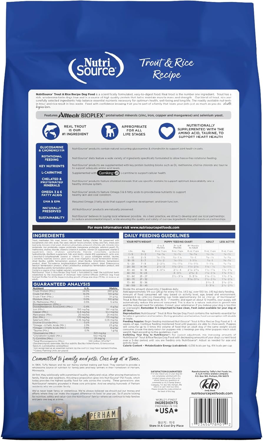 - As a member of our grain inclusive series, NutriSource Trout and Rice Dry Dog Food is formulated to meet AAFCO guidelines for all lifestages