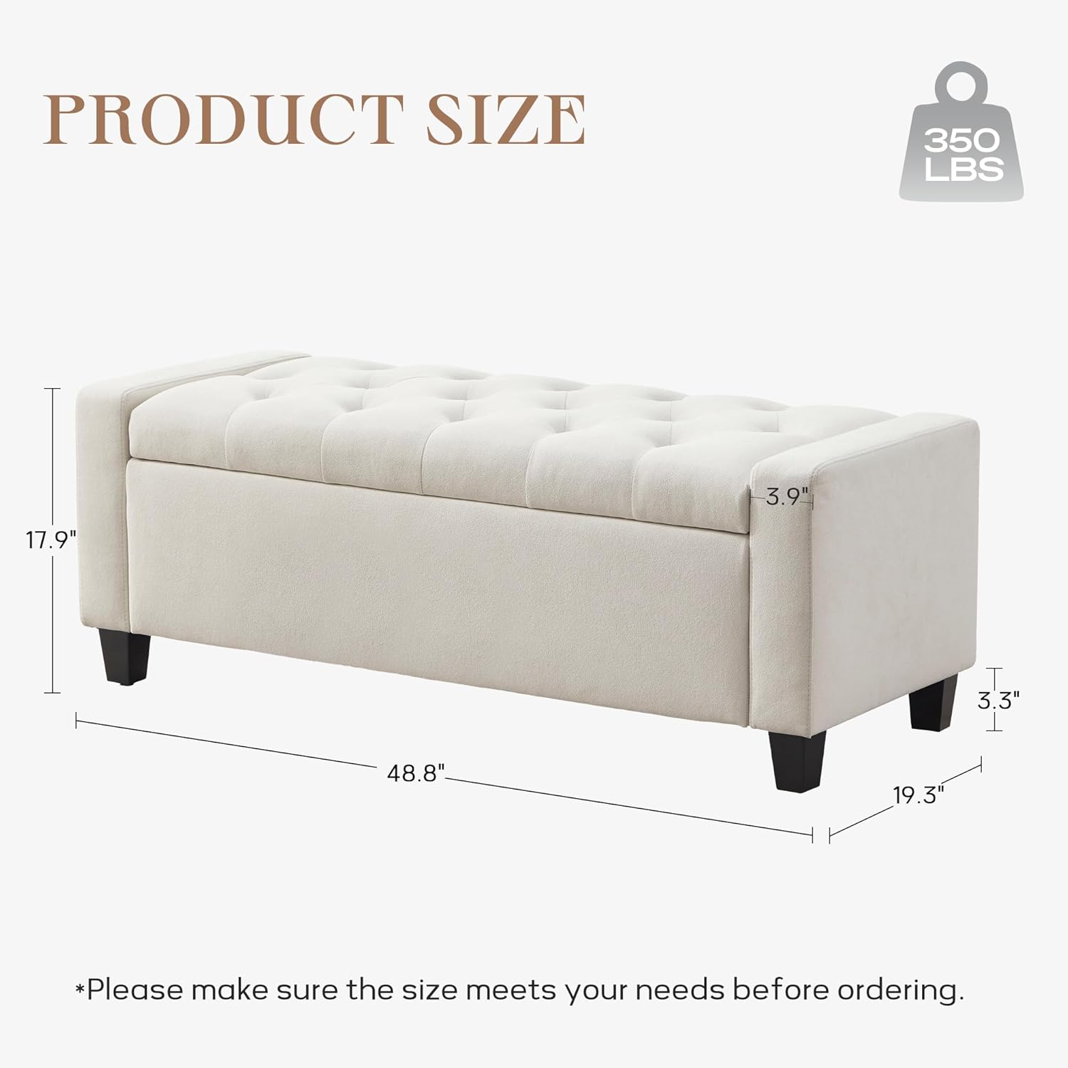 - VERSATILE USE: The bed bench has an upholstered top that is ideal for extra seating, and it also offers hidden storage space for household items. Overall size: 48.8"W x 19.3"D x 17.9"H, interior storage space size: 39.4"W x 16.1"D x 9.8"H. Suitable for any room: bedroom, living room, dining room, entryway