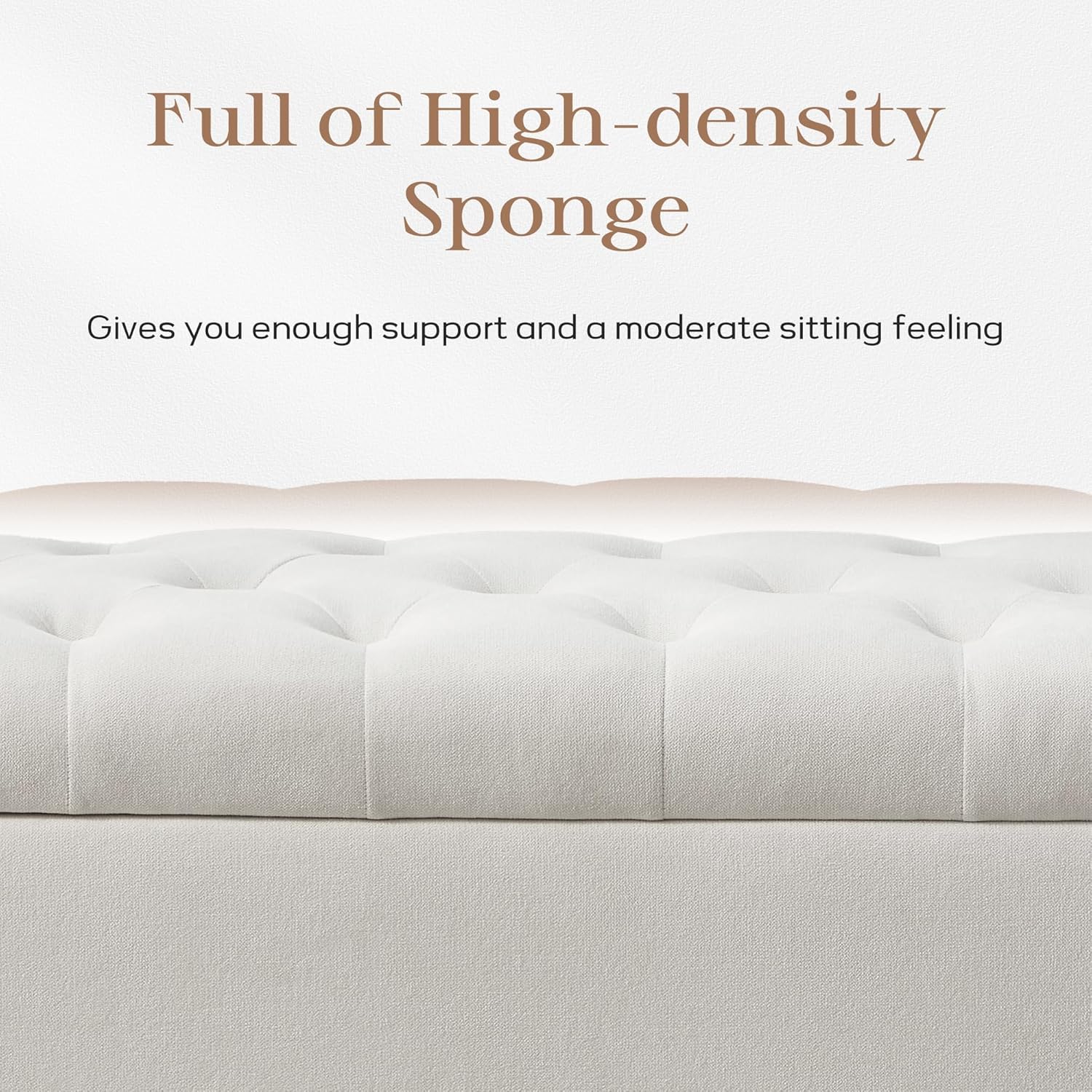 - QUALITY MATERIAL: The end of bed storage bench is made of textured fabric, high density foam and wood frame. The texture of the fabric adds warmth to your home decor. The high-density foam is both flexible and supportive, giving you a comfortable sitting experience that is not too soft and not too hard. The product presents an overall square design with a simple and versatile style that is suitable for a variety of decor