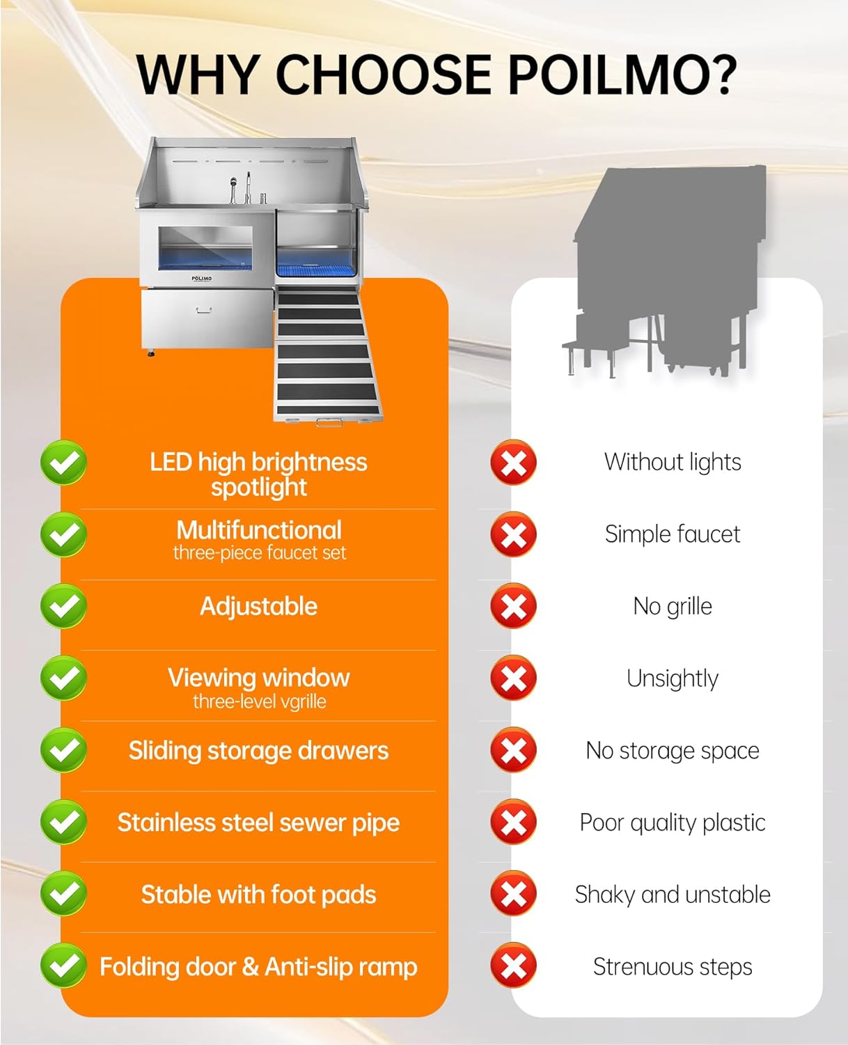 - Innovative and Practical Design: The POLIMO dog grooming station features multiple outstanding design elements: ① IP65 Waterproof high-brightness LED spotlight. ② Grade A tempered glass observation window. ③ The bathtub’s side panels feature a curved slide design, making it easier to operate④ Two-piece floor grid, adjustable to three different heights. ⑤ Sliding storage drawer for organized storage. ⑥ Multi-function faucet and showerhead, adjustable to left, center, or right positions.⑦ Two drainage options are available: one with a pet hair catcher and another stainless steel drain pipe featuring an odor-blocking S-trap design