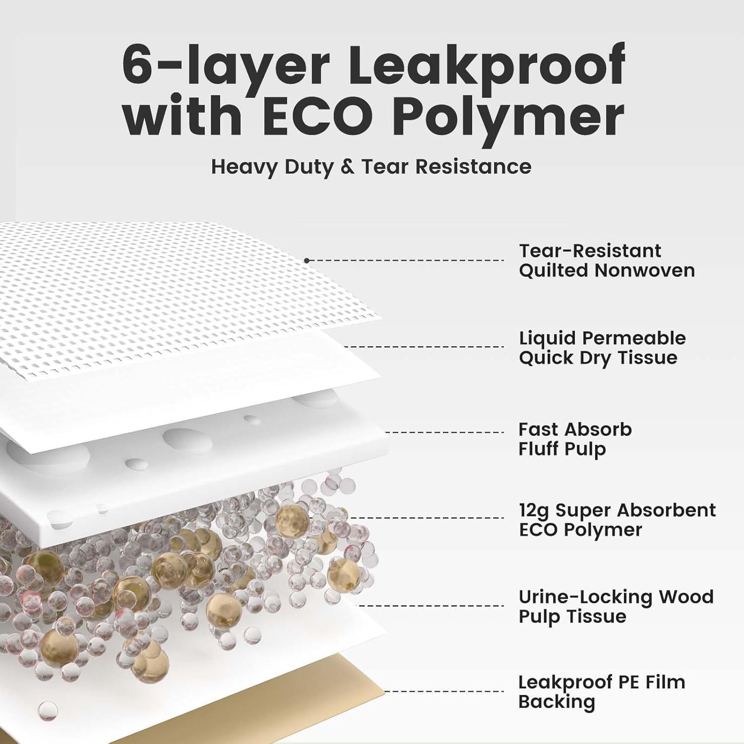 - EXTRA THICKENING, SUPER ABSORBENT: The dog pee pads extra large are made with a 6-layer layered core pad and the thickness of the pads has been increased, which greatly enhances the water absorption capacity. The thickened heavy duty PE waterproof membrane on the back is tear-proof, which can prevents liquid from penetrating into the floor or carpet. This is especially useful pet pads for training puppies, as puppies may go to the toilet frequently in the early stages of training, this xl puppy pads can provide extra protection.