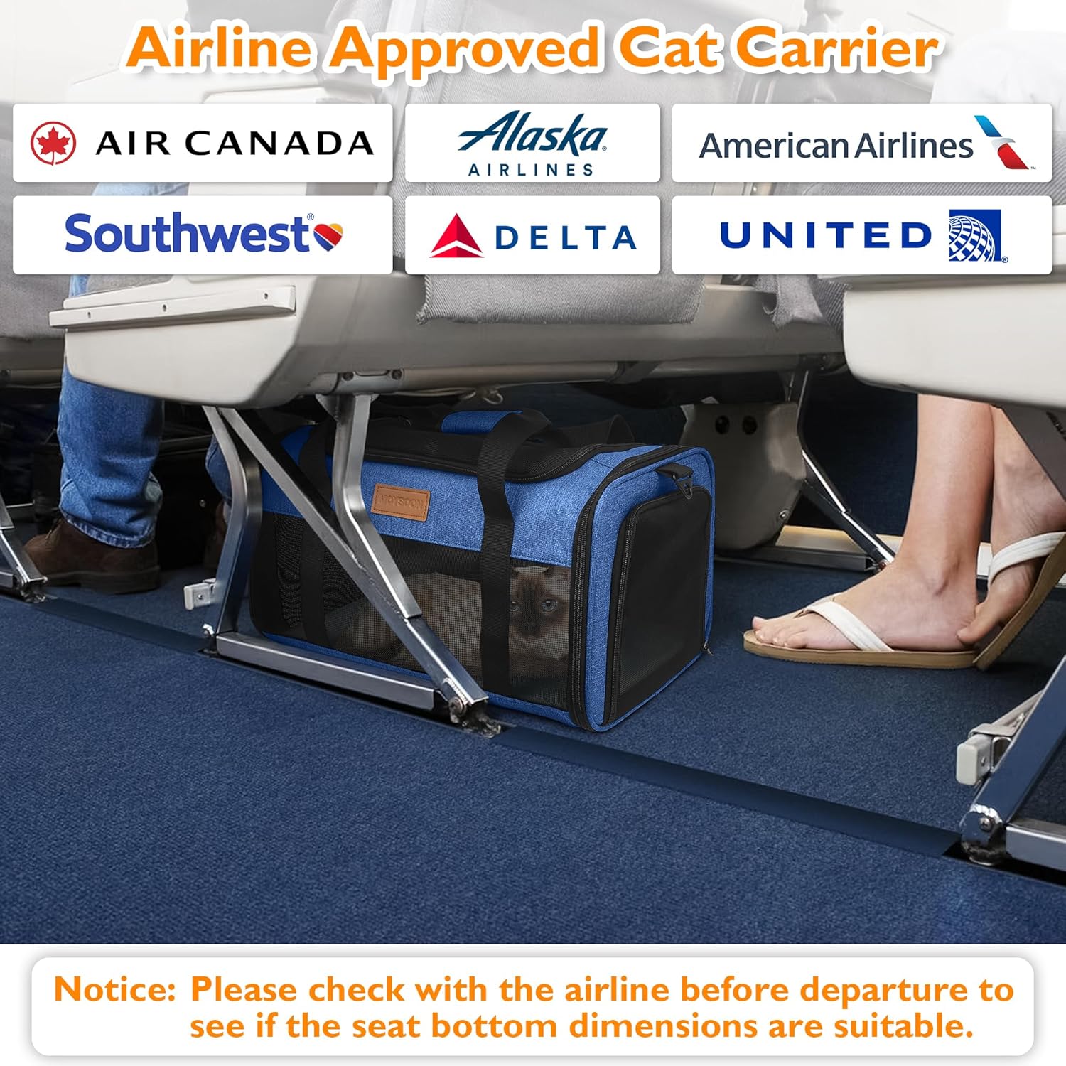 PETUX TSA Approved Pet Carrier in Cabin, 17"x11"x9.5" Soft Cat Carriers for Small Cats up to 12 lb, Top-Open Portable Dog Carrier with Litter Box and Anti-Scratch Mesh for Puppy up to 10 lb (Blue)