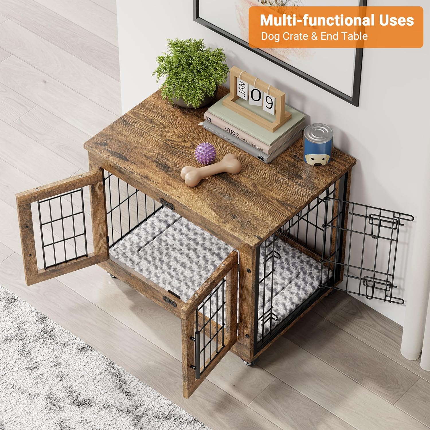 - [Multi-Purpose Dog Kennel Furniture] Provide enough space for dogs to move around, play, and rest and also perfect as a side table or nightstand of storage needs for you. Wood dog crate will blend into any home decor, providing a combination of furniture and function for furry dogs while also being a space saver.