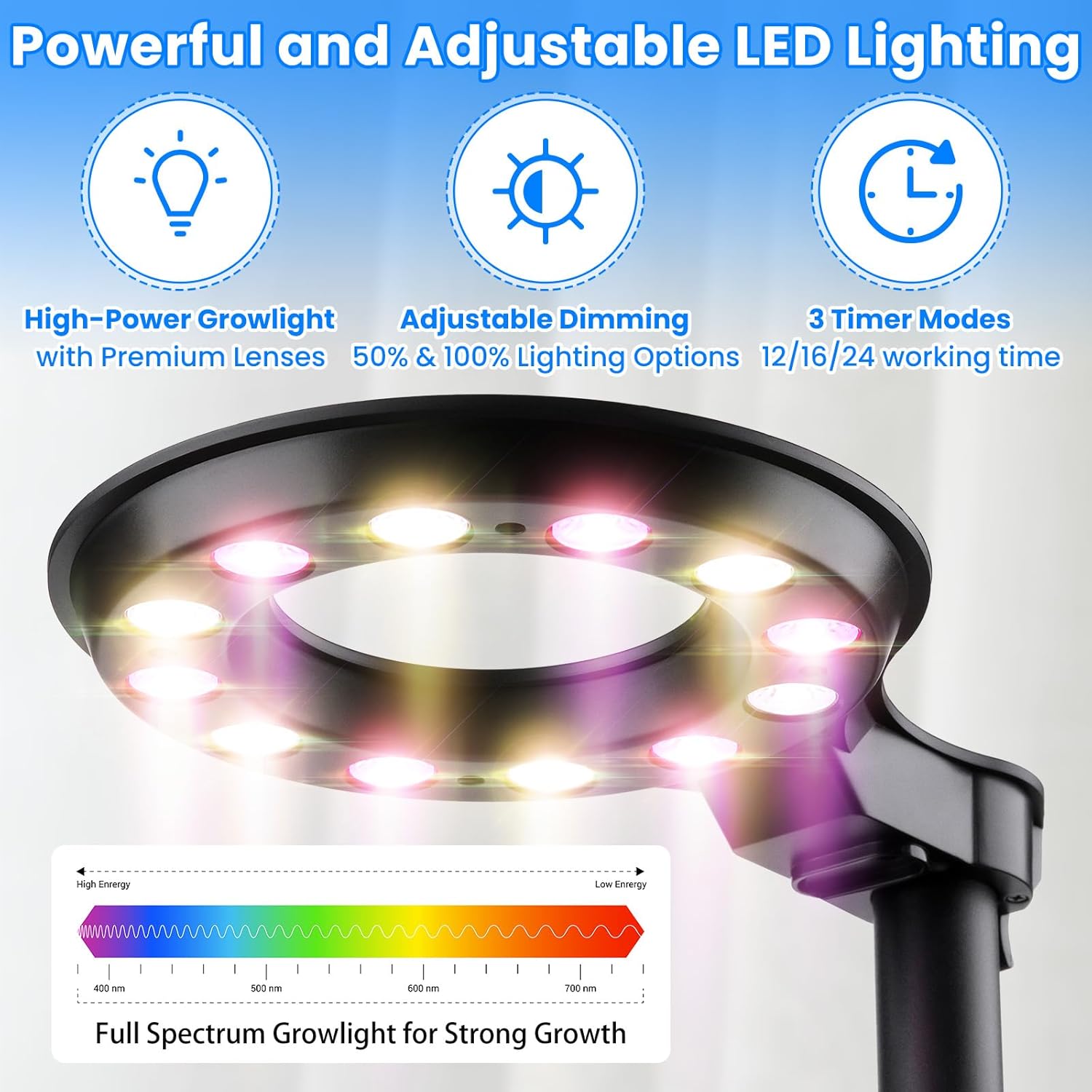 - · High-Powered LED Light: The LED grow lights for indoor plants offer superior lighting for your plants. The full spectrum grow light with timer ensures they get the full spectrum of light needed for healthy growth, whether you are growing venus fly traps or other delicate indoor plants.