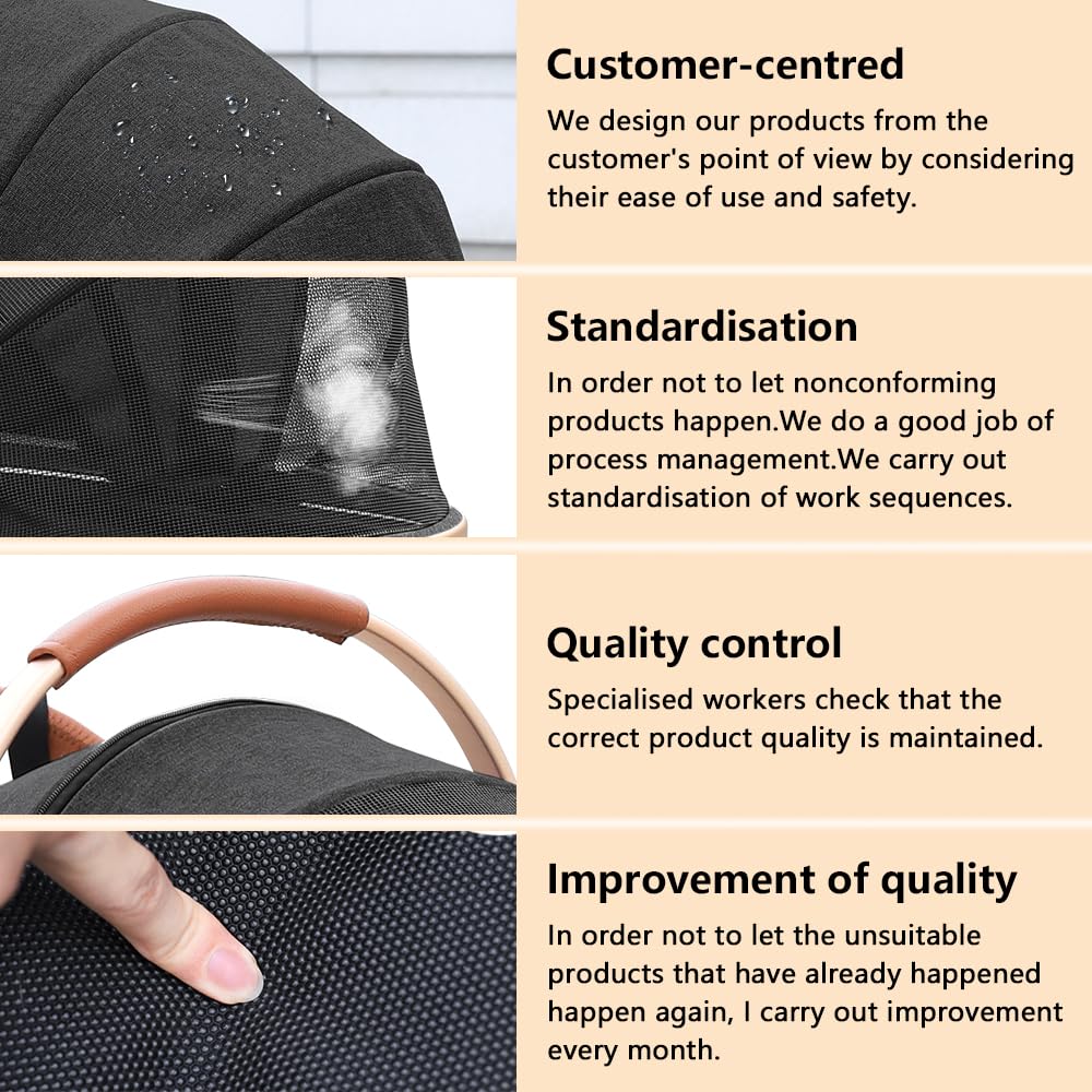 - SAFETY AND RELIABILITY: The four wheels are made of durable PU material to suit all occasions. The pushchair has large wheels and the front wheels can swivel 360ยฐ, these wheels not only ensure durability but also provide smooth and quiet operation. Whether you are walking on the sidewalk or on rough ground, our pet stroller will provide a comfortable and pleasant experience for your pet.