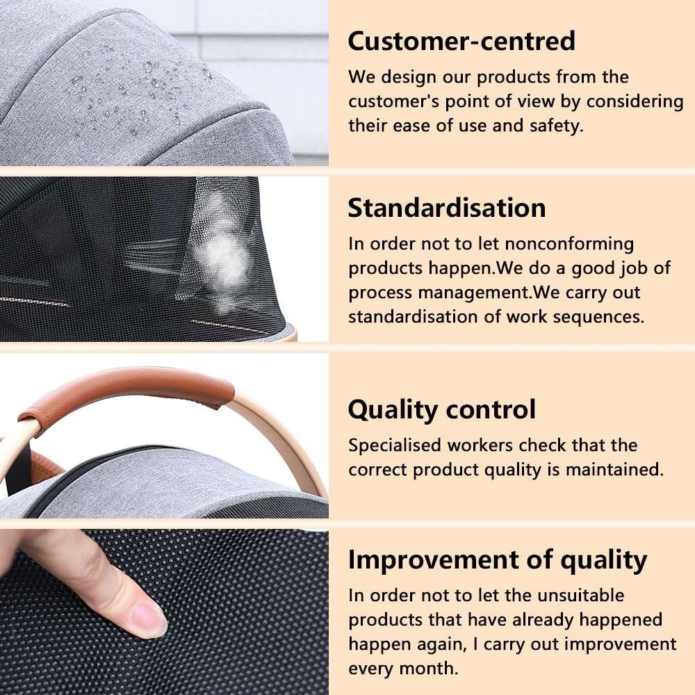 - SAFETY AND RELIABILITY: The four wheels are made of durable PU material to suit all occasions. The pushchair has large wheels and the front wheels can swivel 360ยฐ, these wheels not only ensure durability but also provide smooth and quiet operation. Whether you are walking on the sidewalk or on rough ground, our pet stroller will provide a comfortable and pleasant experience for your pet.