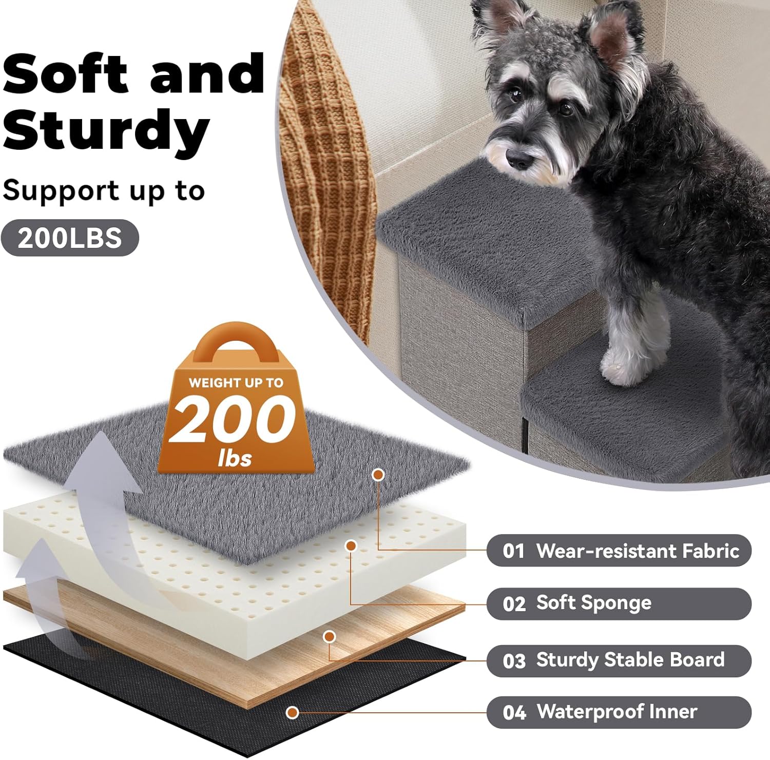 Dog Stairs with Furry Lids 18" H, 3-Step Wider Dog Steps with Storage for Small/Medium/Large Old Dogs Cats, Folding Sturdy Pet Stairs Climbing Bed Couch, Ramp for Car Hold Up to 200 lbs, Grey