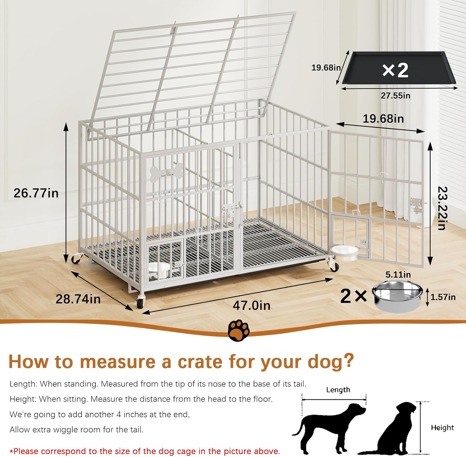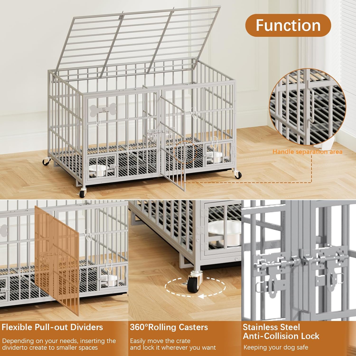 aboxoo 48/42 inch Heavy Duty Metal Dog Crate for 2 Dogs/Large Dog,All Metal Open Top,Dog Kennel Indoor with Wheels,Floor Grid, Tray, Divider and Feeding Bowl (Sliver)