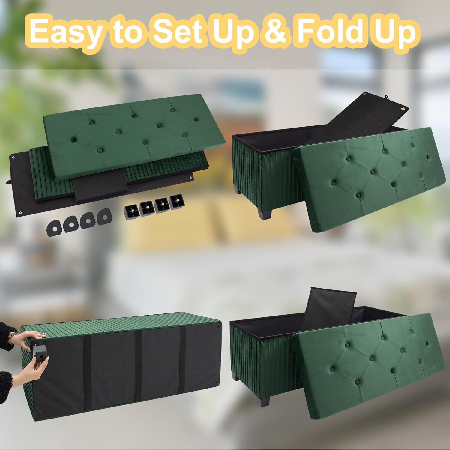 Storage Ottoman Bench, 43 Inch Foldable Ottoman with Legs, Velvet Foot Rest Stool, End of Bed Bench, Storage Chest for Living Room, Bedroom (Green)