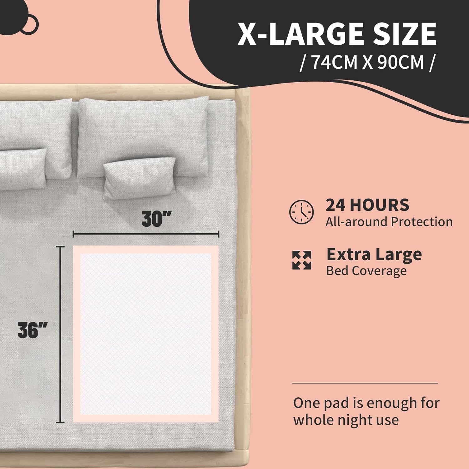 - Extra Large Size for Full Coverage:The 36x30 inch (90x76 cm) size provides complete protection for beds, sofas, and wheelchairs, offering all-day protection for bedwetting kids, adult incontinence, and puppy training.One pad covers it all, perfect chux pads and disposable bed pads for adults