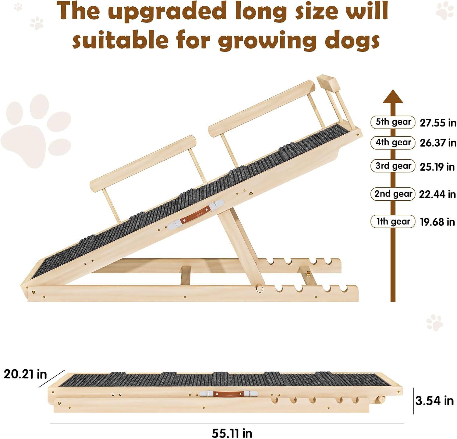- Unbreakable Integrated Construction: Built to last with solid 1" thick pine wood and a seamless, non-folding design, this ramp eliminates weak joints for superior load-bearing capacity. The extra-long 55.11" wooden strip and reinforced structure ensure zero wobbling, while rigorous safety testing certifies it holds pets up to 250lbsâideal for large breeds or multi-pet households.