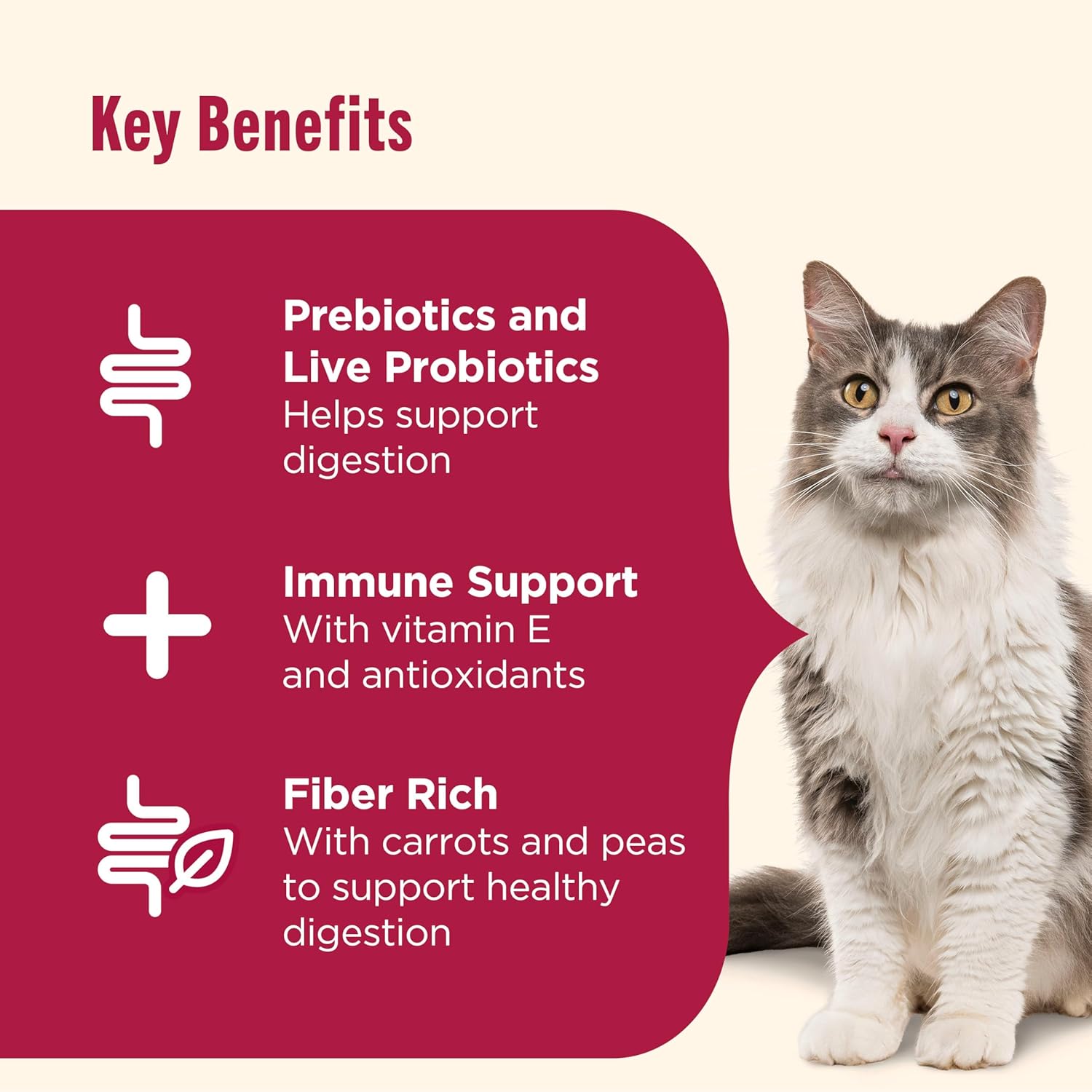 - HEALTHY DIGESTION: Cat food made with prebiotics and live probiotics plus fiber rich peas and carrots to proactively support healthy digestion