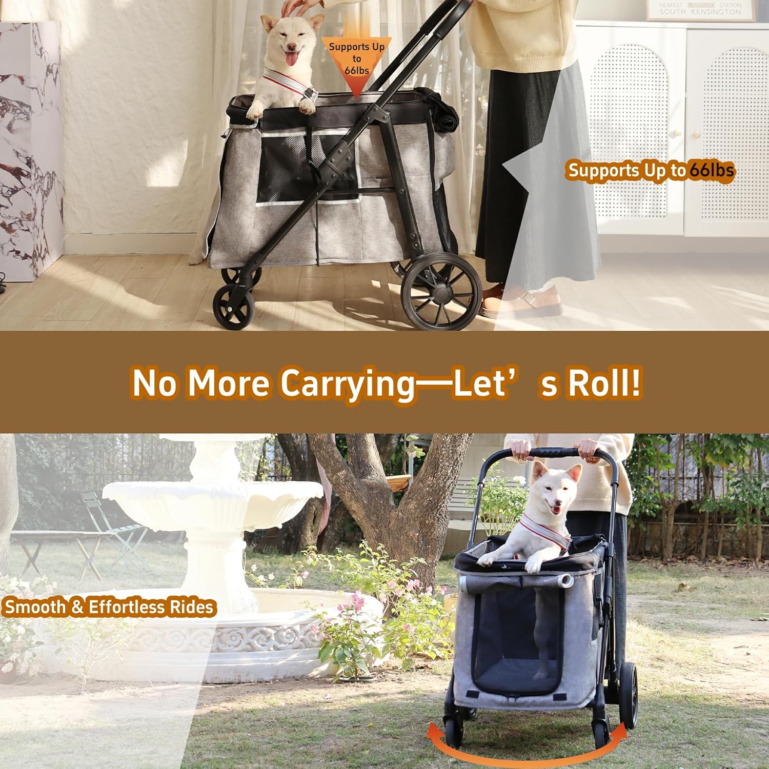 - 【Ideal for Medium to Large Pets】With an interior space of 29.5" (L) x 16.5" (W). It comfortably accommodates 4 small dogs under 15lbs, 2 medium dogs up to 30lbs, or 1 large dog up to 66lbs. The spacious design ensures your pets have plenty of room to relax, making it a versatile choice for multi-dog strollers or pet wagons for large dogs.