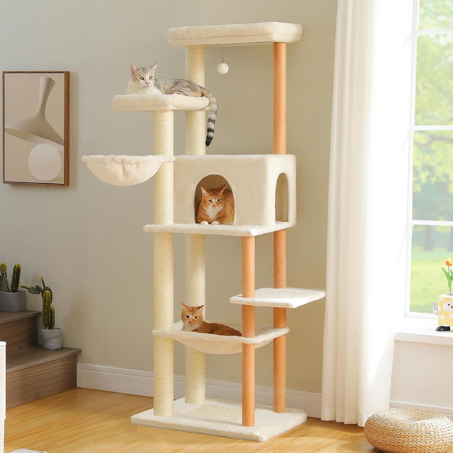- Stylish and Robust Construction: Engineered for superior stability, this heavy-duty cat tower with 2-layer thick bottom of 1" could perfectly support large cats up to 20 lbs. The unique natural wood posts not only provide stronger support than cardboard ones,but also gives this cat tower a stylish and elegant look decorating your home!