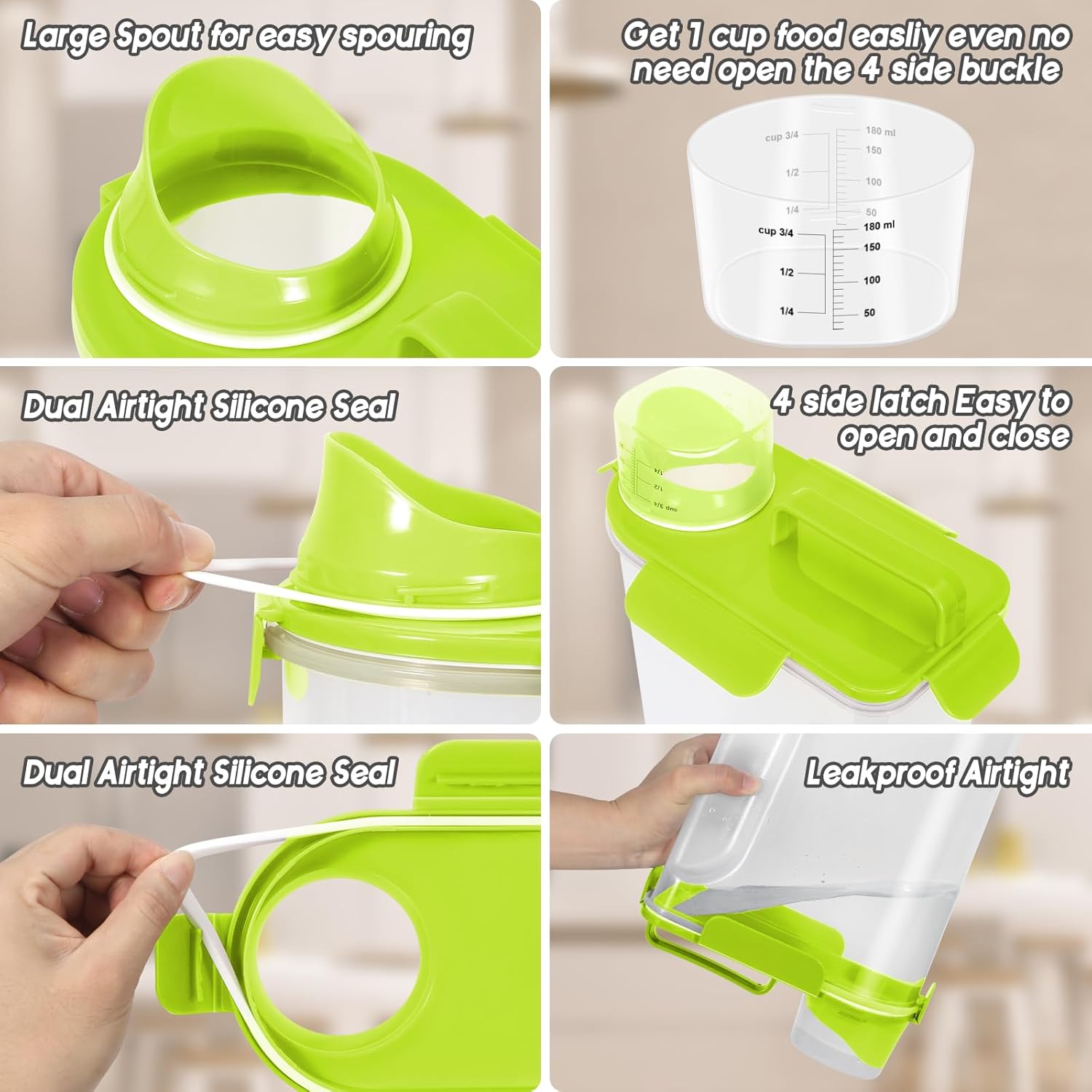 5-7Lbs Cat Dog Storage Container, Portable Pet Food Containers with Upgraded Large Spout and Cup, Small Animal Kibble Dispenser for Bird Seed, Oatmeal, Rice, Flour (2, Bright Green, 5L)