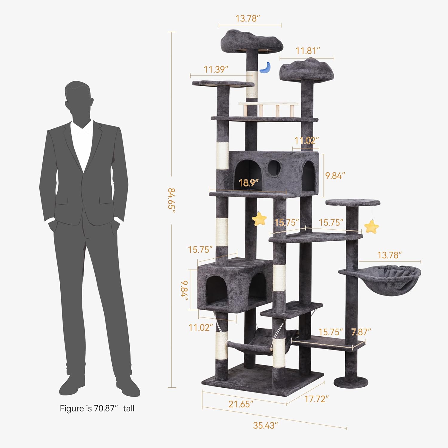 85in Giant Cat Tree for Heavy Duty Big Cats, Large Cat Trees with Scratching Post, Cat Tree Tower with Cat Condos, Hammock & Plush Perch for Maine Coon, Smoky Gray