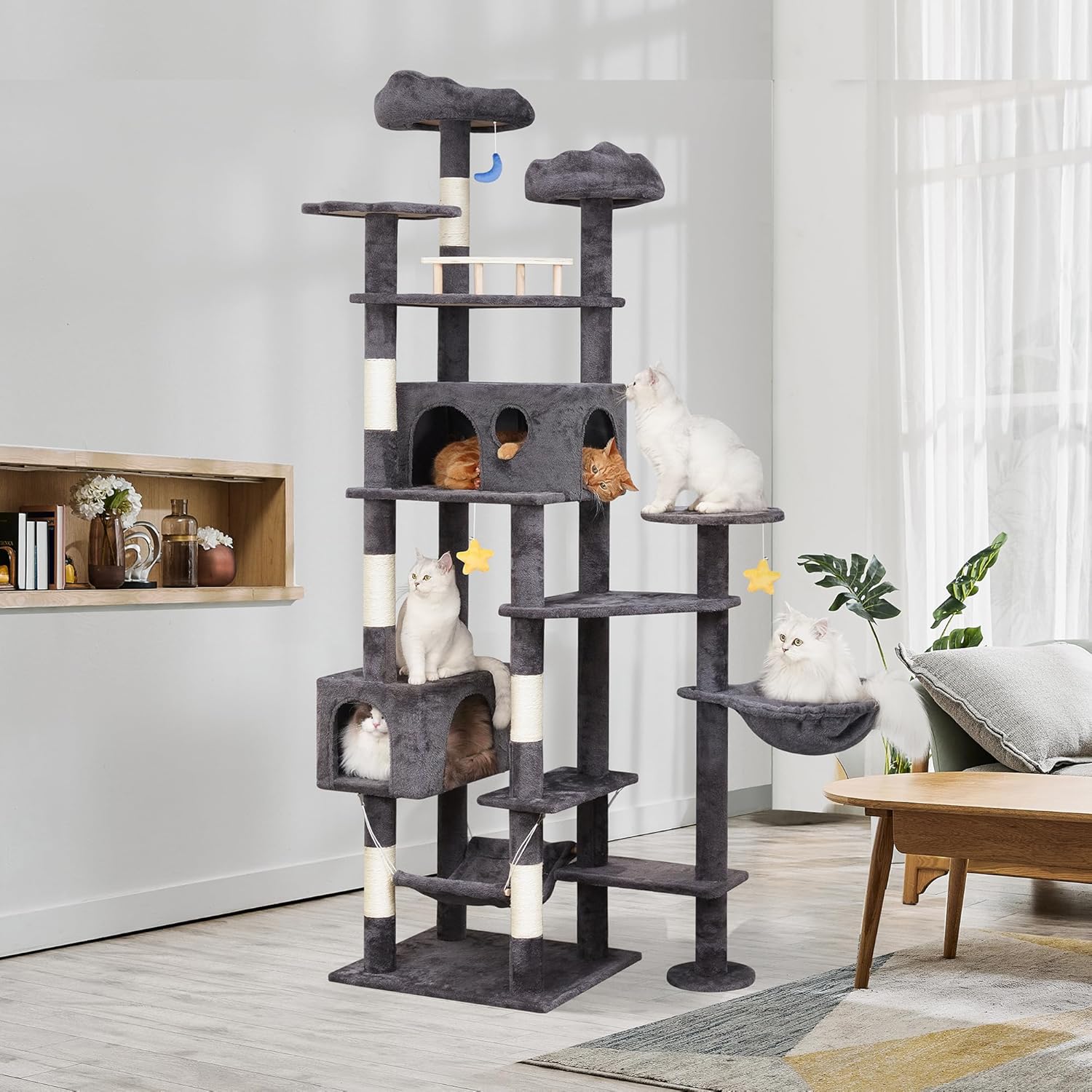 - 【All-in-one Cat Playground】This extra large cat tree provides various features to satisfy your cat's needs. It includes sisal rope-covered scratching posts for different scratching habits, a multi-level climbing cat playground designed for multi-cat households, plush toys for interactive play, two soft cat condos to hide in,and two different hammocks for resting and sleeping