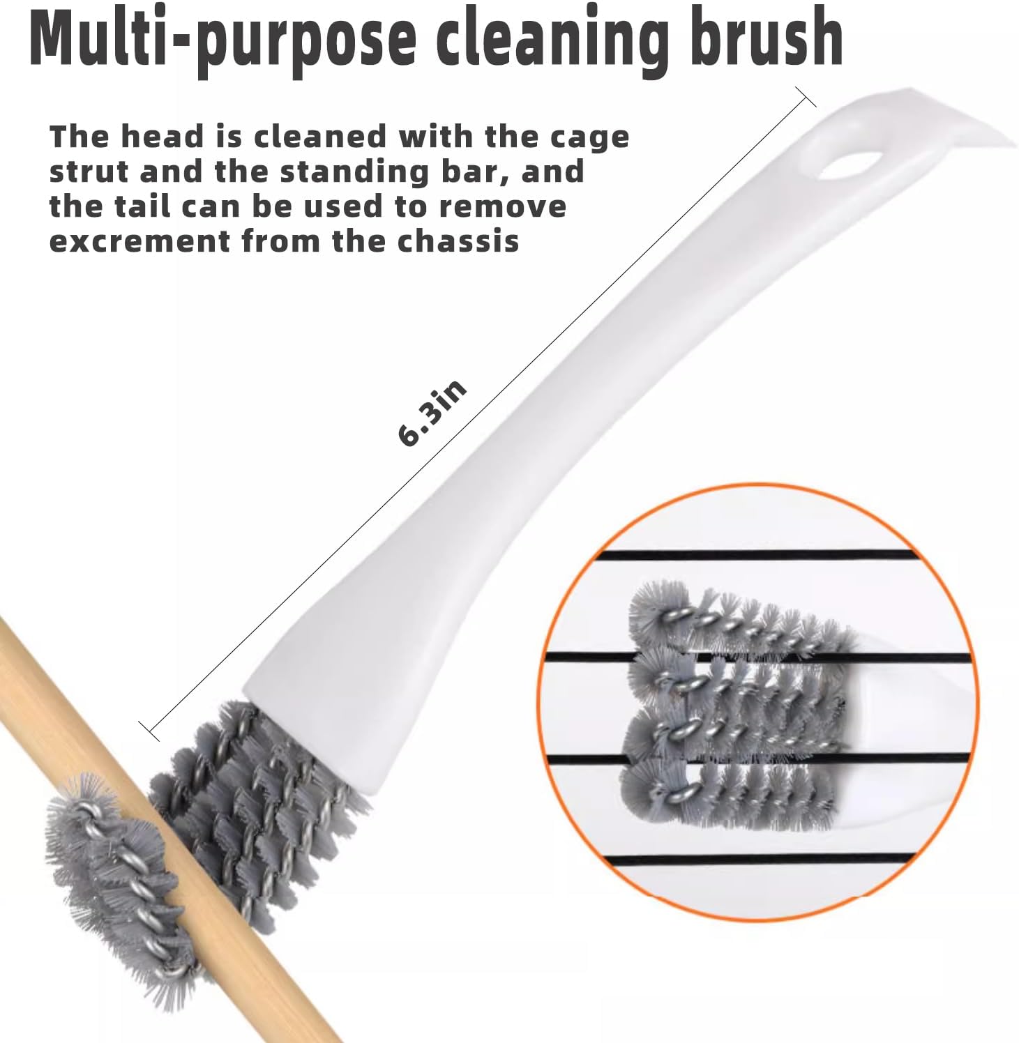 - Dimensions: (1) Stainless steel cleaning shovel is 6.5 inches long and 1.8 inches wide (2) Cage post cleaning tool is 9.5 inches long (3) Stainless steel wire brush is 8.8 inches long (4) Multi-purpose brush is 6.3 inches long (5) The small broom is 7.3 inches long and 4.7 inches wide