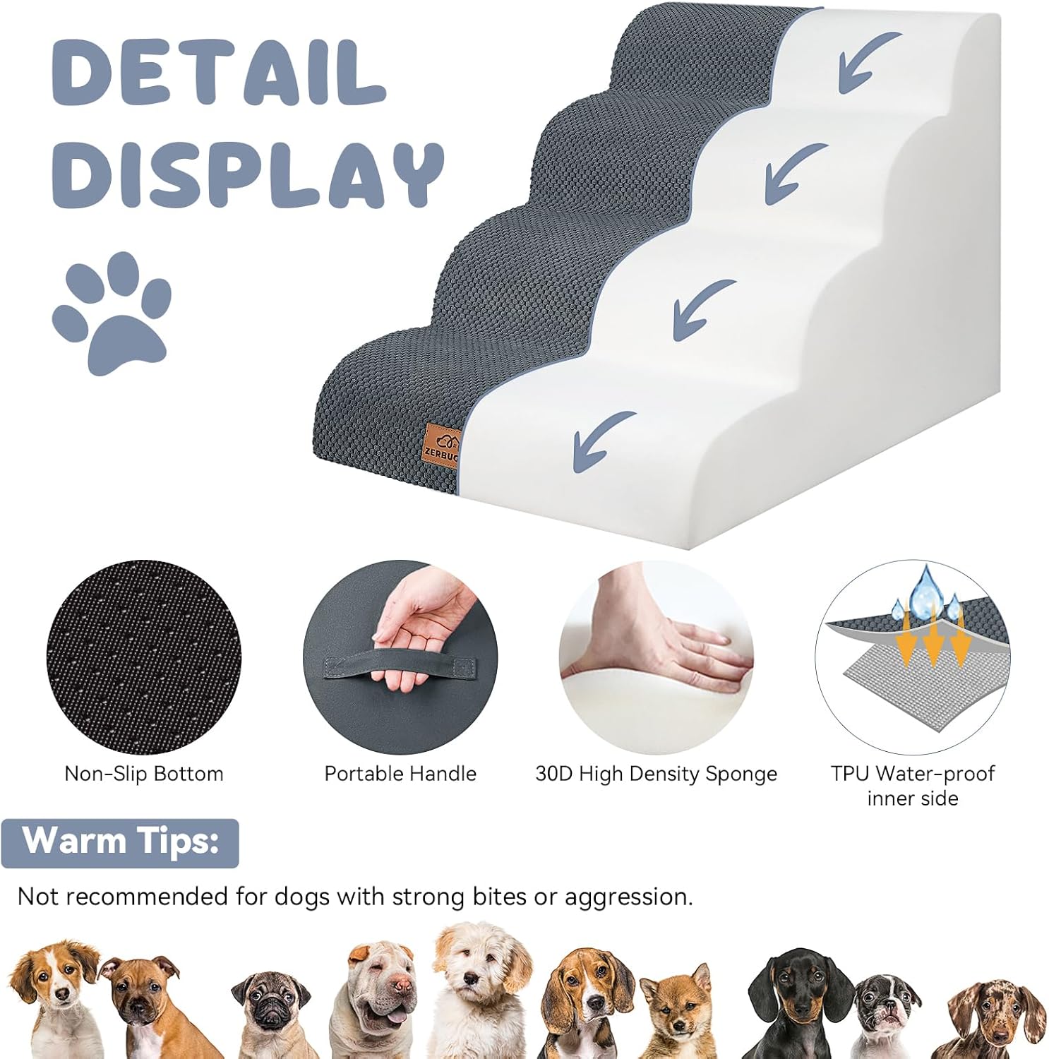 - Ideal Choice for Furry Friends Indoor: Pet owners, pay attention! If your furry friend is elderly, short-legged, injured, or a small cat or dog, Zerbuger Dog Stair is a must-have item for you. It's extremely suitable for indoor use and works great in living rooms or bedrooms. Small pets love it, and it's very useful when taking care of pets. With our stair, pets can easily and safely climb up and down high places like sofas, chairs, beds. Our pet step can also teach dogs to climb and allows pets to reach the window to enjoy the view.