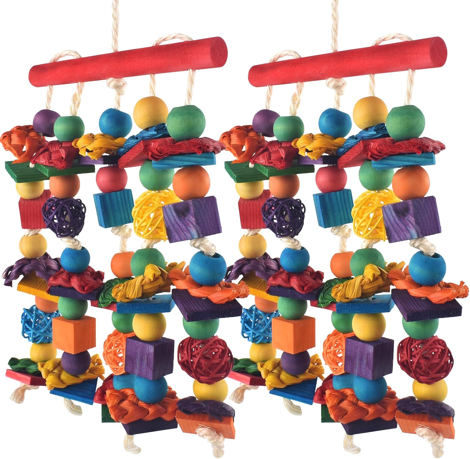 - Natural Materials: DBNESS bird foraging toys are made of natural materials and are completely handcrafted, including 100% twine rope, natural multicolored wood blocks, wood beads, rattan balls, cornhusks, a metal hook. Bite-resistant and durable materials provide your pet friends with a safe and fun way to chew and climb