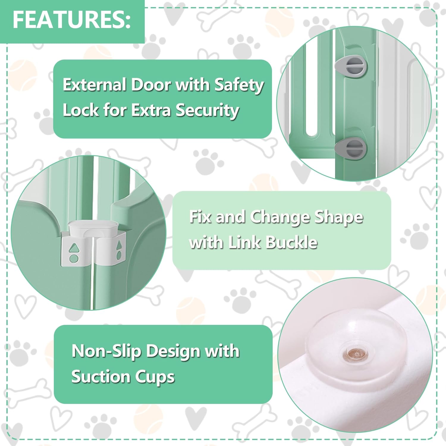 - NON-SLIP STABILITY: The non-slip design with suction cups and link buckle holds the fence firmly in place,making it perfect for active pets and smooth surfaces that require extra grip.The dog play pen is suitable for bedroom,living room or balcony use.