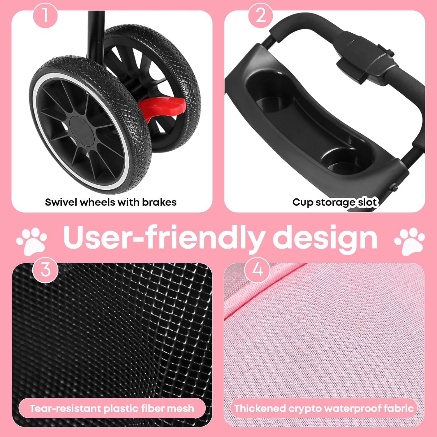 - [All-Terrain Safety & Control] The cat stroller equipped with 360ยฐ swivel front wheels for smooth maneuverability and dual rear brakes for instant stopping power. It glide seamlessly on sidewalks, grass, or uneven terrain, ensuring a safe ride