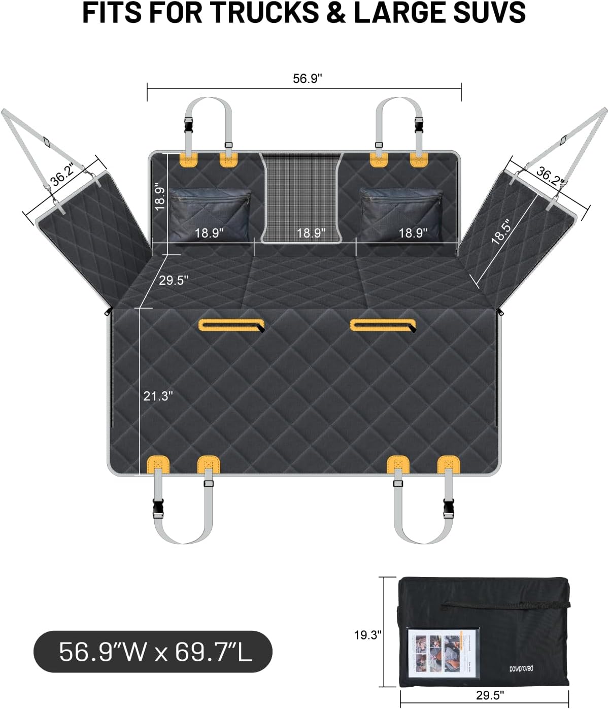 - Extended Activity Space: Our car hammock (56.9βW x 29.5βD) prevents footwell sliding, expands space by 40%, and ensures safety for movement and stretching to ease travel anxiety. Offers full rear-seat coverage, ideal for large breeds, older dogs, or multi-dog households.