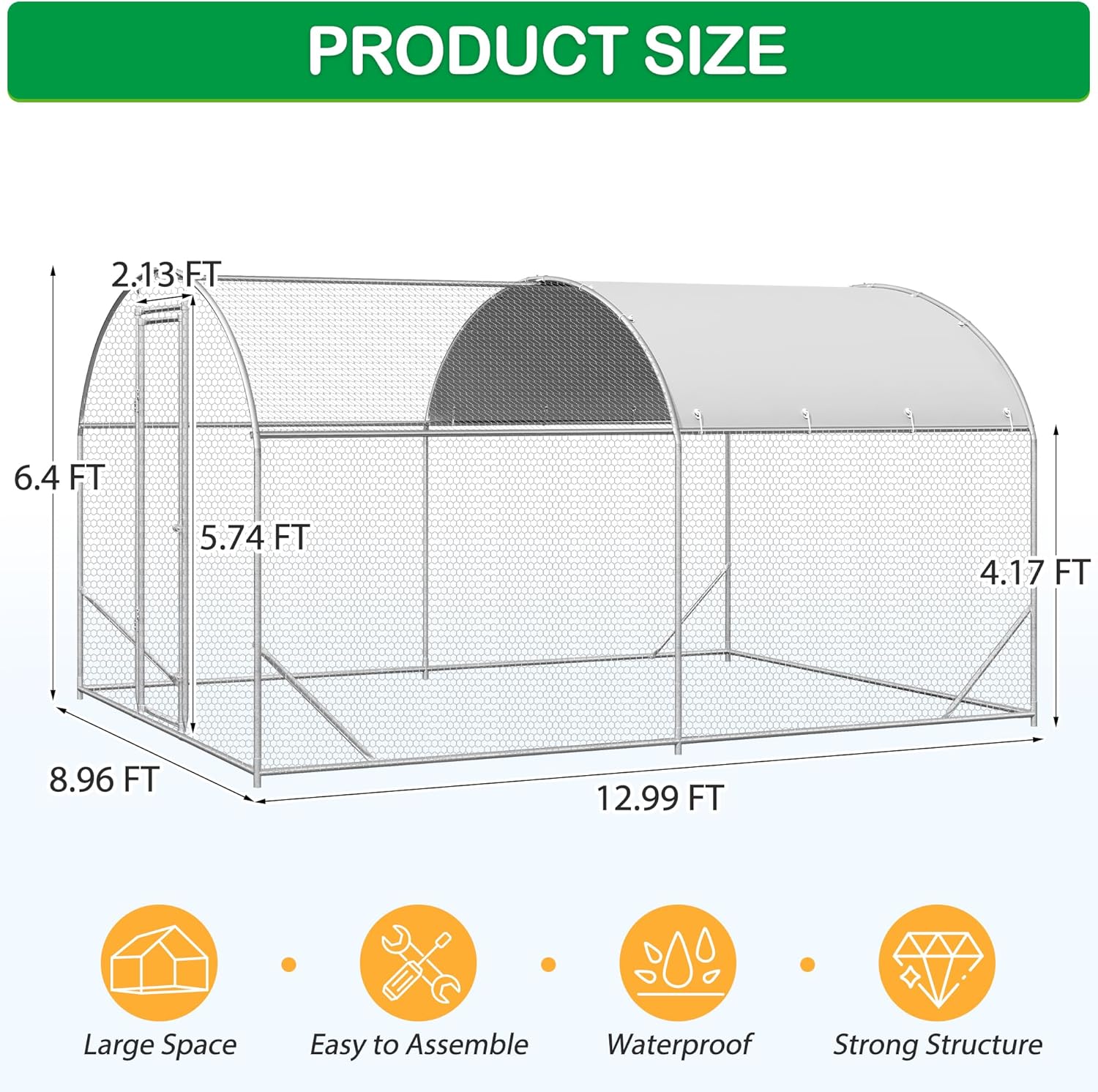 Large Metal Chicken Coop, Walk-in Chicken Run Pen with Waterproof Cover, Dome Roof Poultry Cage for Outdoor, Backyard, Farm (8.96'Wx12.99'Lx6.4'H)