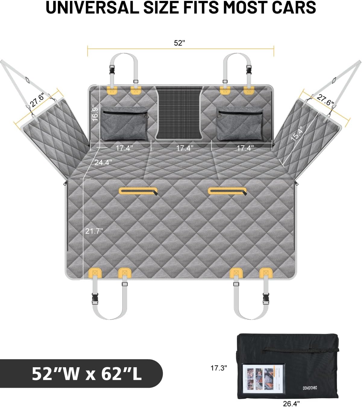 - Extended Activity Space: Our car hammock (52.3โW x 24.4โD) prevents footwell sliding, expands space by 40%, and ensures safety for movement and stretching to ease travel anxiety. Offers full rear-seat coverage, ideal for large breeds, older dogs, or multi-dog households.