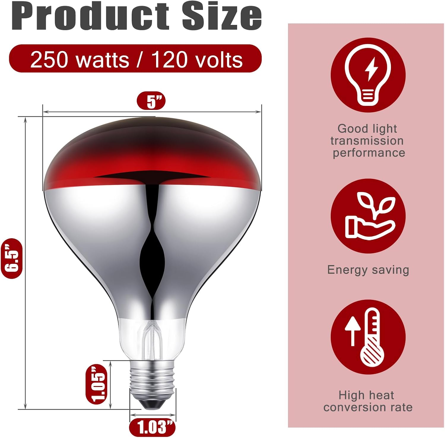 - Suitable Parameters: the heat lamp for chickens comes with a parameter of 250 watts and 120 volts, making them suitable for providing a warm and necessary environment for baby chicks, turtles, lizards, and other pets; The parameter of these bulbs is carefully designed to ensure that they can provide the right amount of heat without overheating or causing discomfort to your pets; And the Kelvin color rating for bulbs is 2700k