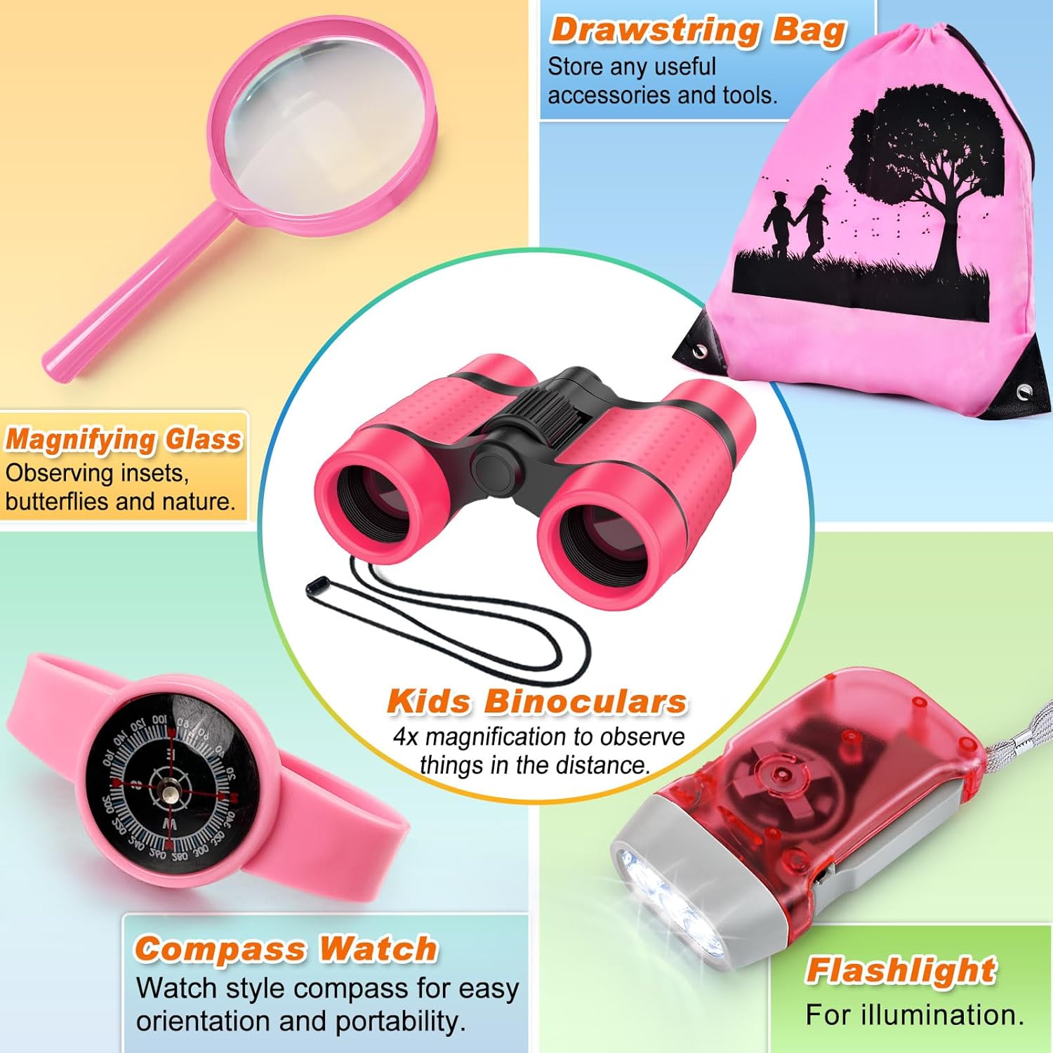 - Everything in One Box: This exploration set will fulfill all your child's needs for outdoor exploration, the explore kit comes with a high-quality Backpack, Flashlight, Binocular, Inset Tweezer, Magnifying Glass, Whistles and Compass watch. Kids can always bring this gear ready to go and explore the mysteries of nature!
