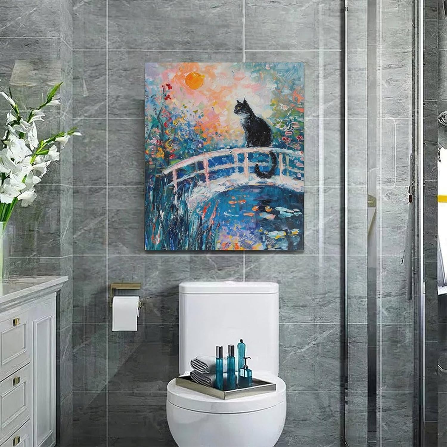 Quorin Black Cat Wall Art Water Lily Sunset Pictures Cat Wall Decor Impressionism Canvas Print Painting Artwork for Bathroom Living Room Bedroom 20"x24"