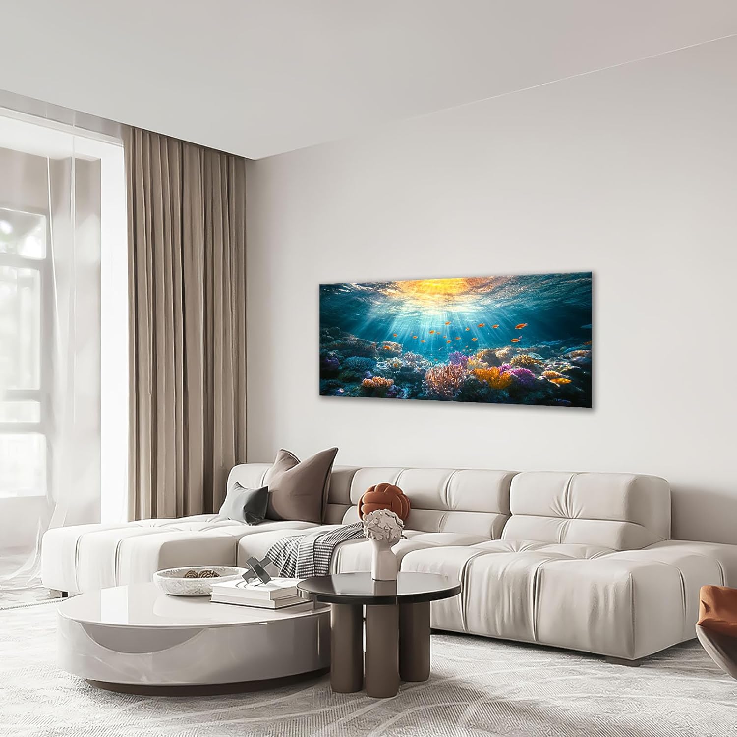 - 【Unique Design】A vibrant coral reef with colorful fish swimming around, sunlight filtering through the water creating beautiful light rays.