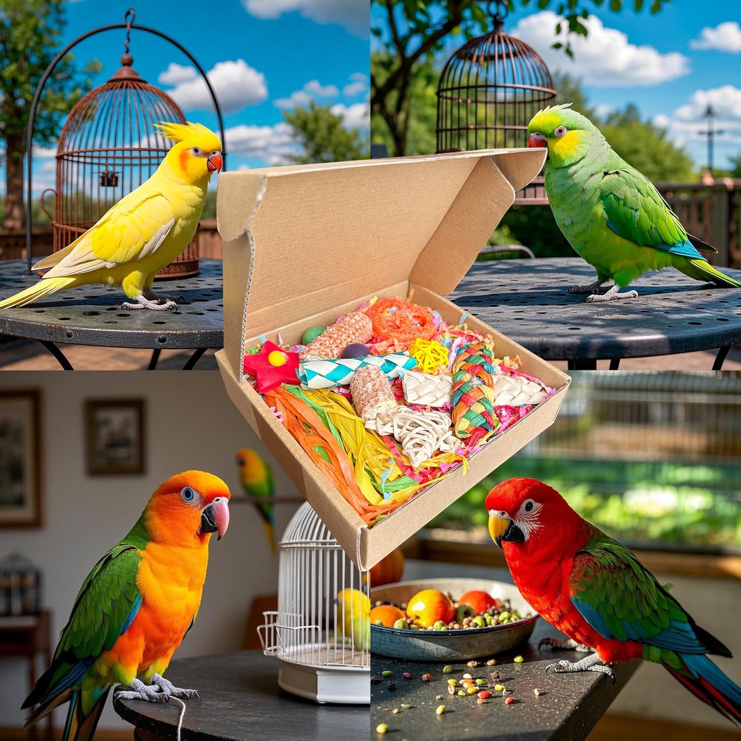- NATURAL BIRD TOYS EXCLUSIVE DESIGN: Incorporates four natural behavioral layers: Tear Zone: Colorful shredded paper simulates a jungle leaf search. Foraging maze: hidden to stimulate the exploratory instincts Grooming texture: natural fibers promote healthy beak development 3D Climbing Net: 30ยฐ angled path that conforms to the bird's structure