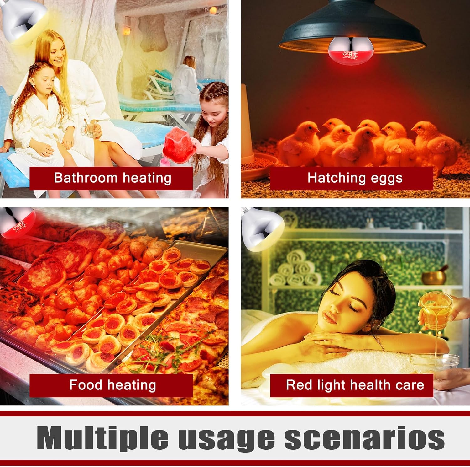 - Practical and Versatile: there are 4 pieces of bathroom heat lamp bulbs, which are an essential tool for pet owners and farmers alike; With their standard E26 medium screw base design, these bulbs are easy to operate and install, making them suitable for a wide range of occasions; They can be applied to provide radiant heat to keep your pets warm, create a sunbathing area for temperature adjustment, and even make reptiles and amphibians more active and comfortable