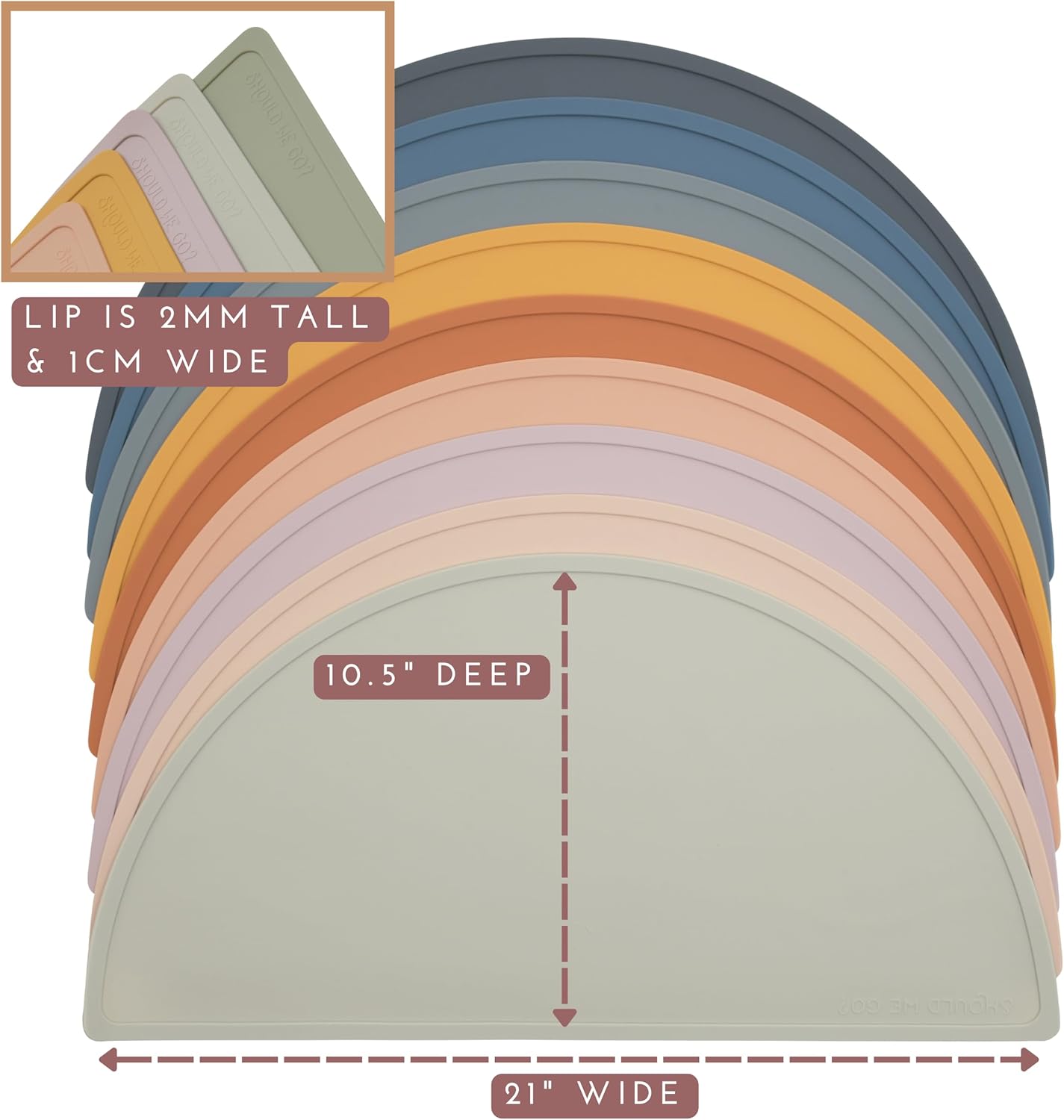 - CONTROL SPILLS AND MESSES: Our silicone pet food mat with a raised edge helps keep spills and messes on the mat. The medium size mat is 21" across x 10.5" deep. It works with bowls that are 7.5" across or smaller. The lip is .2" tall and .4" wide.