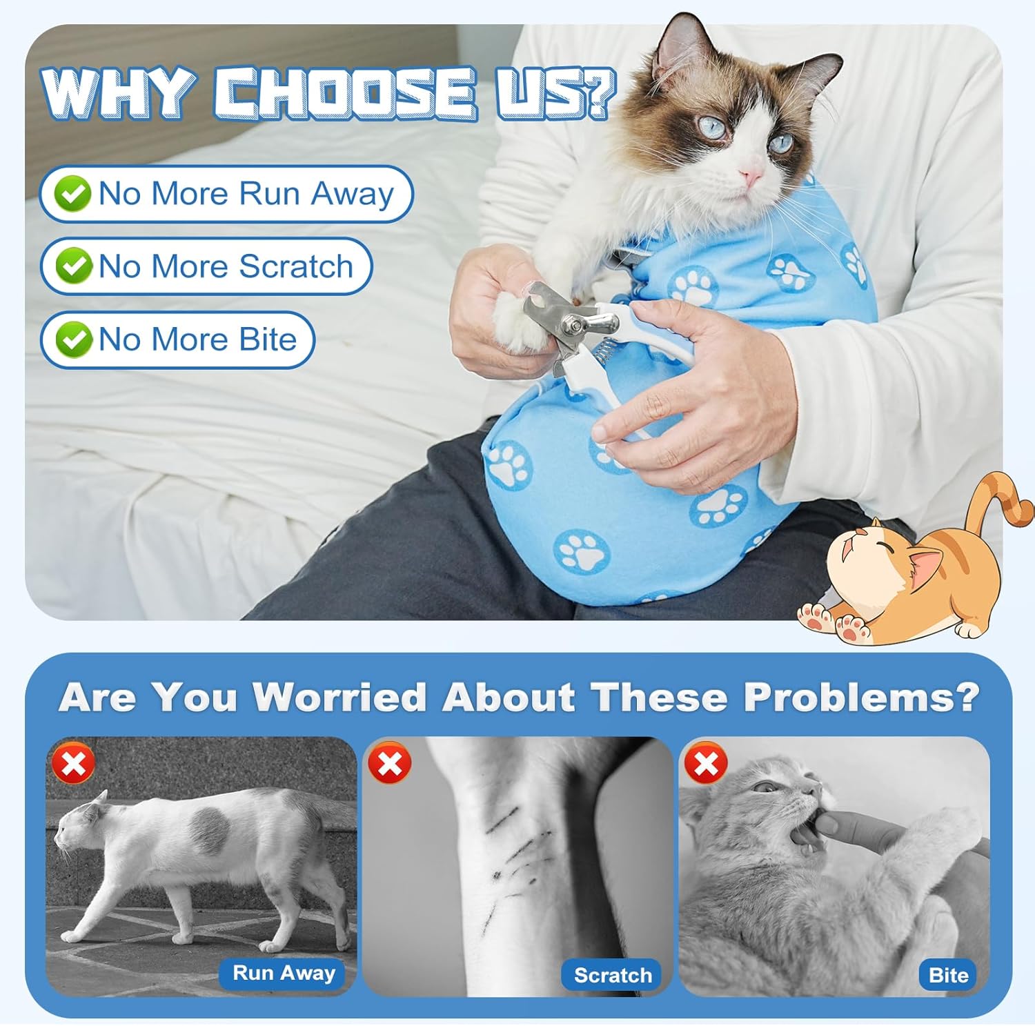 - Versatile Use for Multiple Needs: Beyond just nail trimming, our cat wrap is a multifunctional tool for all your cat's grooming needs. It's perfect for brushing teeth, cleaning ears, administering eye drops, giving medication, and de-tangling fur. A one-stop solution for all your cat's care requirements, our cat wrap is the ultimate addition to your pet care routine.