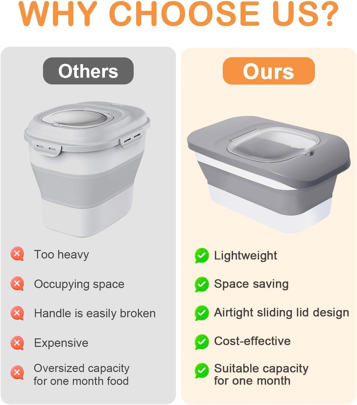- Space Saving: Our pet food container is collapsible and can be resized to pet food storage as needed. Whether at home or on the go, itโs designed to make pet care easier and more enjoyable