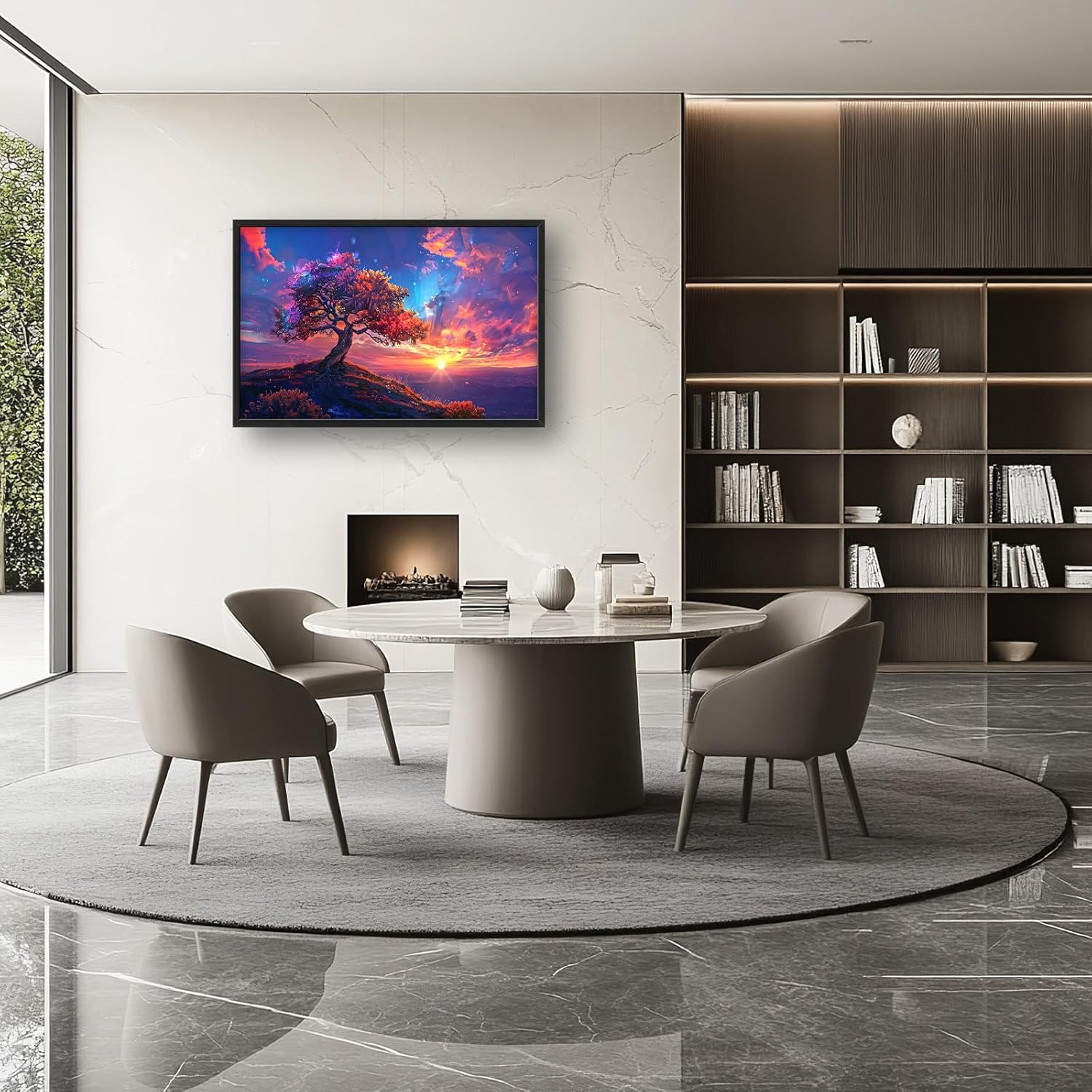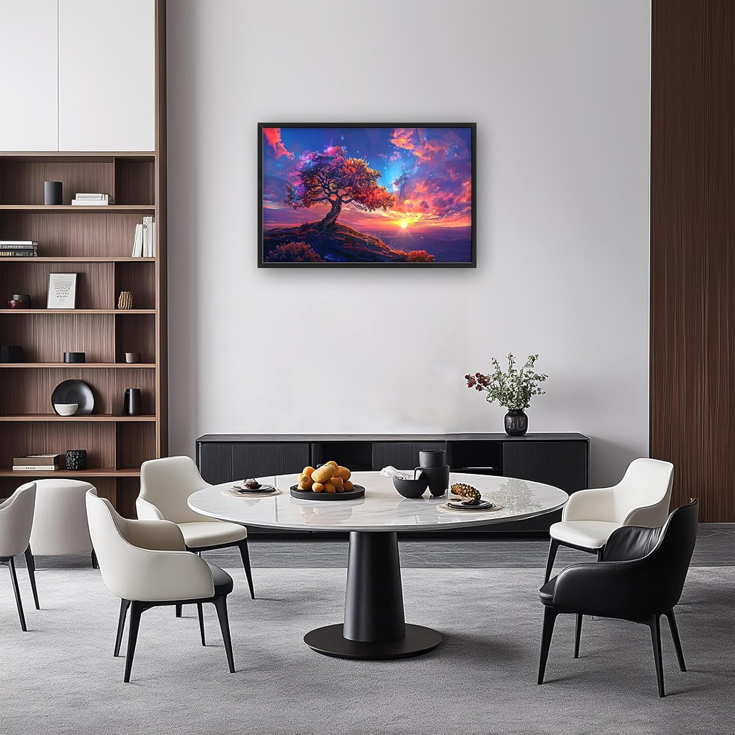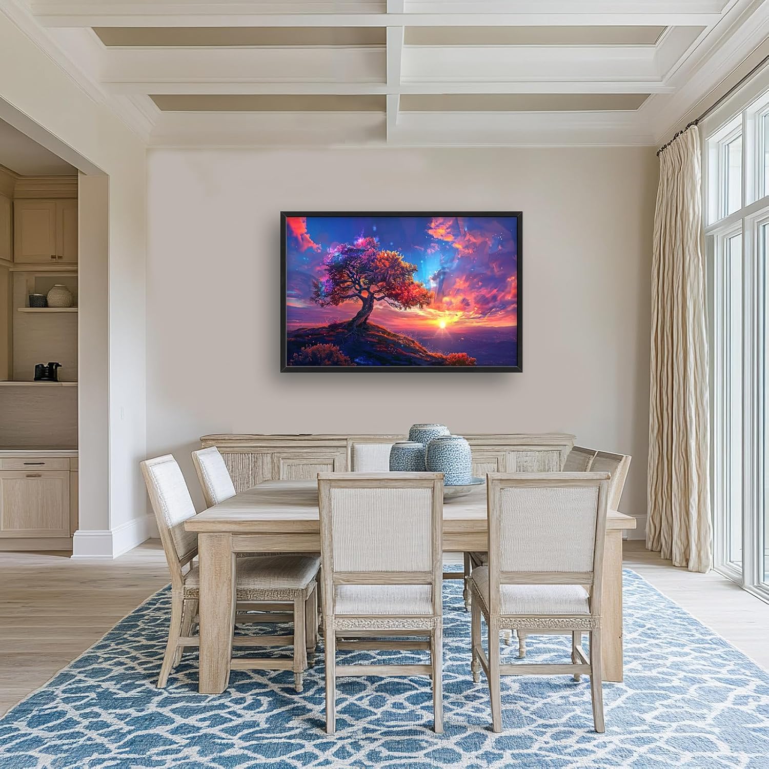 - 【Unique Design】A majestic tree with vibrant leaves stands on the edge of an ancient mountain, overlooking vast skies filled with swirling clouds and shimmering stars. This painting is in the style of fantasy art, with colorful, romantic sunset rays, and a highly detailed background. The scene is bathed in the warm glow of the golden hour, resulting in a beautiful, realistic landscape with a rainbow of colors.