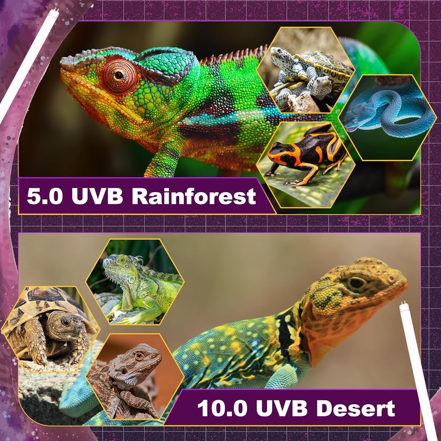 - VERSATILE APPLICATIONS: REPTISPA T5 UVB reptile light is ideal for various reptiles and amphibians, no matter they originate from rainforest or desert. 5.0 UVB bulb is suitable for tropical rainforest species, such as chameleons, snakes, aquatic turtles and frogs. 10.0 UVB bulb is perfect for desert dwelling reptiles, such as bearded dragons, tortoises, uromastyx, and collard lizards.
