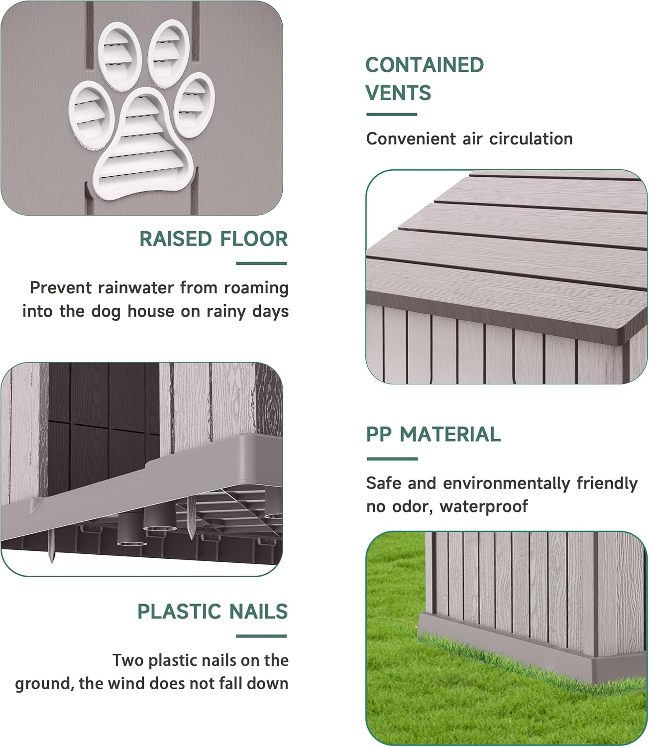 - Sturdy and Durable: This big dog house is made of high quality PP (polypropylene) material, which is extremely durable.The PP material is scratch-resistant, abrasion-resistant, and also waterproof. It can withstand all kinds of weather conditions, such as rain and sunlight exposure, and is not easily damaged.