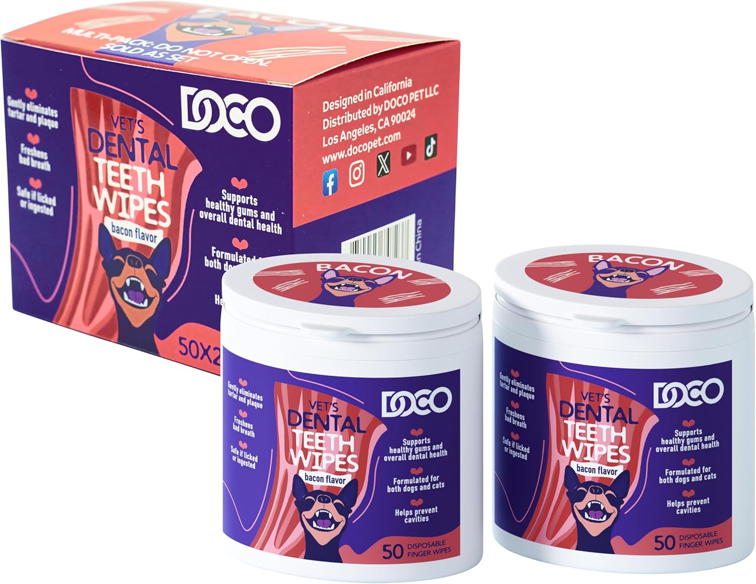 DOCO Dog Teeth Cleaning Wipes Dental Finger Wipes for Cats & Dogs Remove Plaque & Tartar, Freshen Breath, No Rinse, Easy & Effective Pet Tooth Cleaning Kit for Oral Care, Bacon Flavor, 100 Count