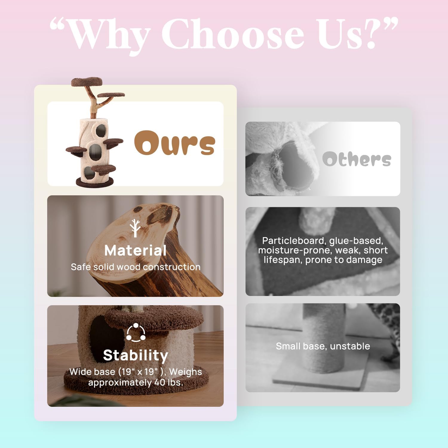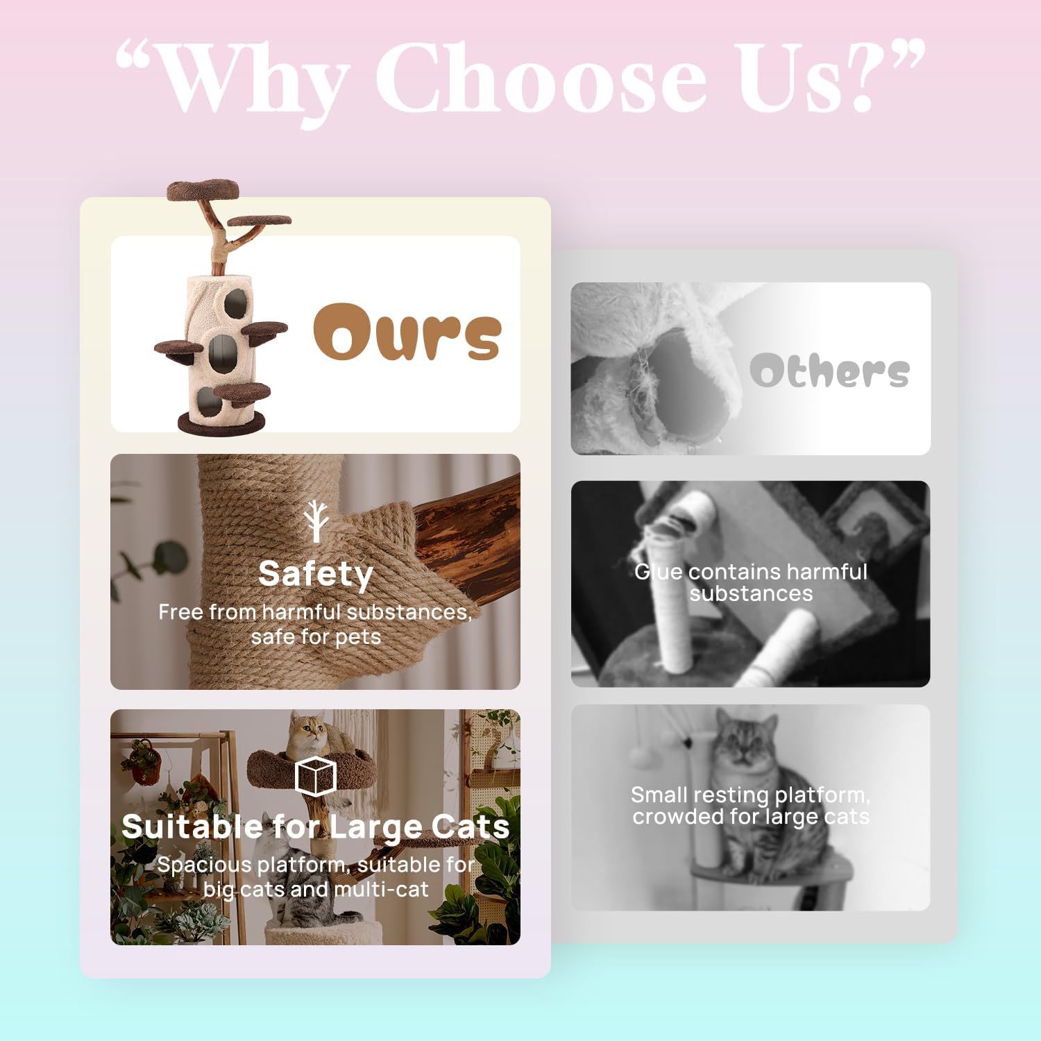- Premium Eco-Friendly Materials: Cat tower crafted with hand-polished natural fruitwood branches (2-3" diameter) showcasing unique wood grains. Wrapped in durable natural jute rope for extended scratching use. Features an ultra-stable 40.2-lb base (1.2" thick) and E1-certified MDF boards. Compact 0.18γ‘ footprint blends seamlessly into home decor.