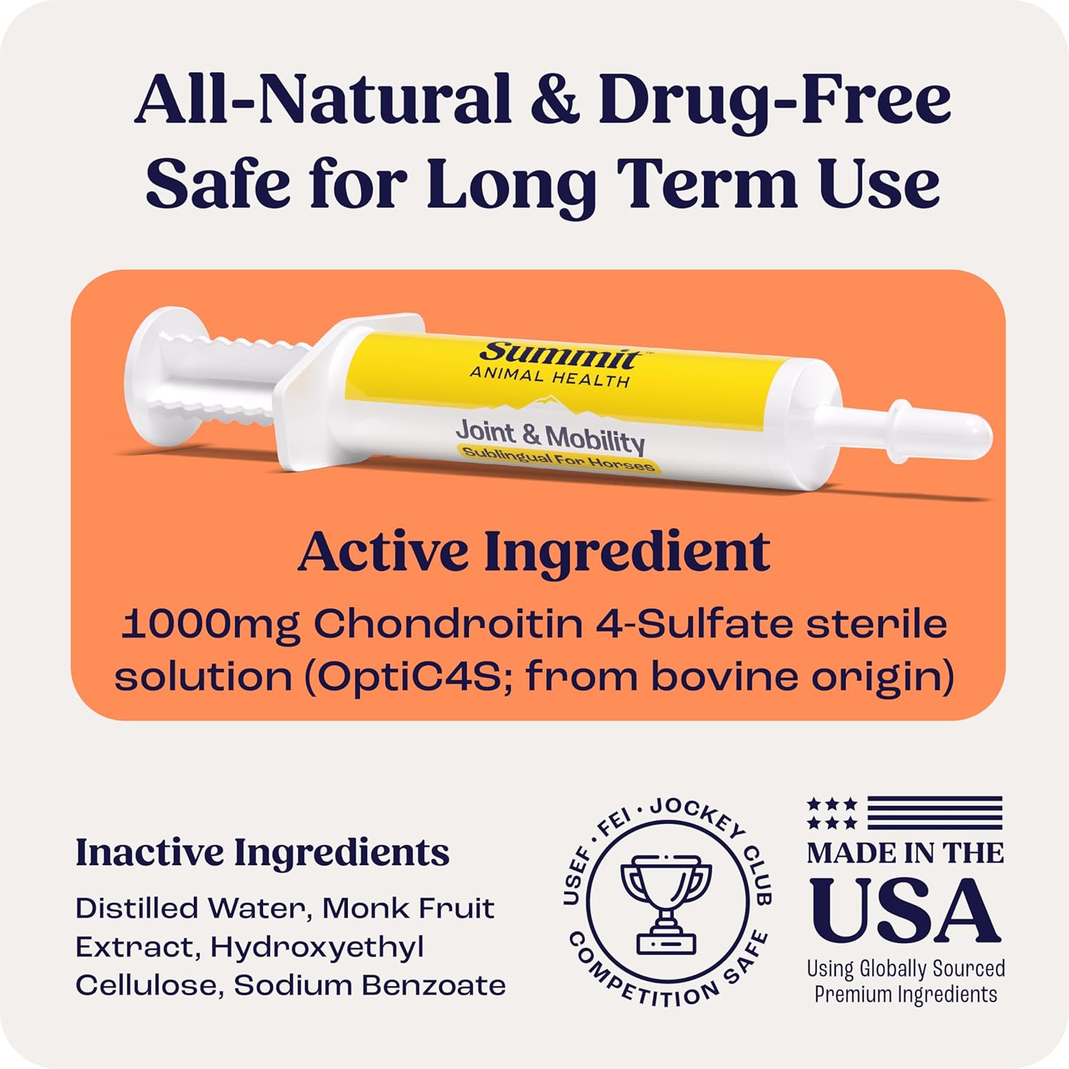 - High-Purity Chondroitin 4-Sulfate: Each dose contains over 99% pure pharmaceutical-grade chondroitin 4-sulfate (bovine origin), essential for maintaining healthy cartilage and joint function, thereby enhancing your horse's mobility and comfort.