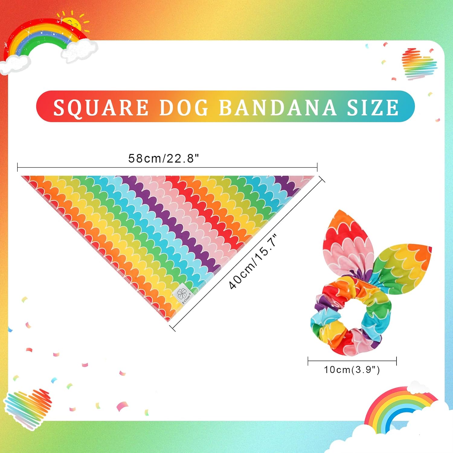 E-Clover Rainbow Dog Bandanas & Matching Scrunchie Set Girl Cute Pride Dog Scarf Bibs Pet Bandana with Bow Tie for Small Dogs Puppy Owner Mom Summer